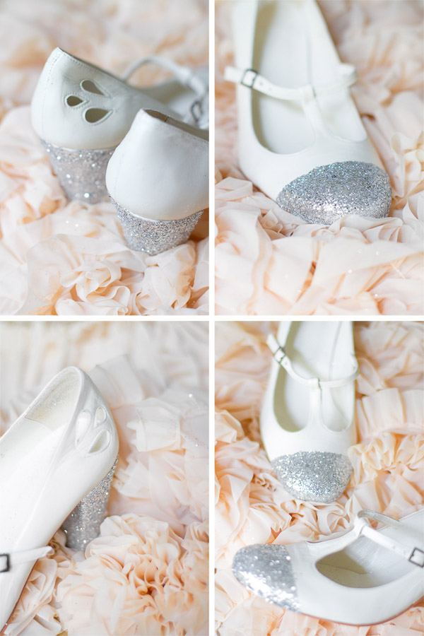 Te ha costado decidirte pero finalmente y después de muchas visitas y largas tardes de dar vueltas y más vueltas por tiendas especializadas, showrooms, estudios y ateliers has encontrado el vestido de tus sueños, te das por satisfecha y te relajas pensando que lo más importante ya lo has conseguido pero… llega el momento de los zapatos. Y, horror, vuelven los nervios porque no te acabas de decidir. En un principio parece que lo difícil sea dar con el vestido de novia perfecto pero no os confiéis, porque por experiencia os digo que a veces cuesta más encontrar los zapatos apropiados que el mismo vestido ya que en este caso también hay que tener en cuenta la estética de la boda o el lugar donde se va a celebrar. Si queréis algo especial y no lo acabáis de encontrar siempre podéis personalizarlos, el tutorial de hoy os ayudará a dar un toque diferente a unos zapatos de corte clásico con un poquito de purpurina. Podéis elegir unos zapatos que os gusten muchísimo y resaltarlos mucho más o unos que no os acaben de convencer y transformarlos totalmente. Tened en cuenta que el tutorial, como la mayoría de los que publicamos, también lo podéis aplicar para unos zapatos de invitada o incluso de fiesta, ahora que las navidades están a la vuelta de la esquina. Podéis cubrir con purpurina una única parte del zapato o varias, en el ejemplo se ha cubierto la punta y los tacones pero podéis resaltar sólo la punta, la parte del talón o simplemente dar un pequeño toque en uno de los lados. Para empezar, vais a necesitar: Un par de zapatos, purpurina de dos tamaños (en este caso plateada), pegamento de uñas, un pincel y cinta adhesiva.