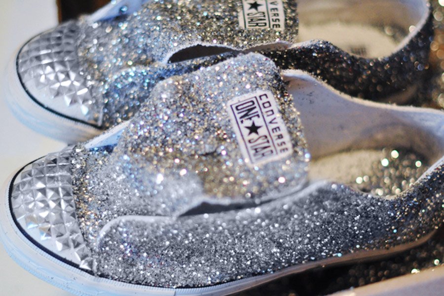 DIY: ZAPATOS GLITTER zapatos_glitter_19_ Esta semana sigo enganchada a los brillos y he encontrado una manera original de dar un punto de glitter a vuestros zapatos de boda, bueno más bien a vuestras deportivas de boda. Son ideales para el momento del baile cuando ya no podemos aguantar los tacones, aunque cada vez son más las novias que optan por la comodidad de principio a fin y se atreven con ellas durante toda la boda, pero eso ya va según gustos. El tutorial de hoy está inspirado en un modelo de zapatillas de Miu Miu pero para hacerlo se han utilizado unas Converse, aunque podéis usar el modelo que queráis incluso con bota o sin ella. Vais a necesitar: unas zapatillas deportivas (en este caso blancas), pegamento para tela, pincel para aplicar el pegamento, purpurina plateada, purpurina fina negra, cinta de pintor, tachuelas piramidales plateadas, un platito y una caja de cartón. Os animo a intentarlo porque el resultado es espectacular.
