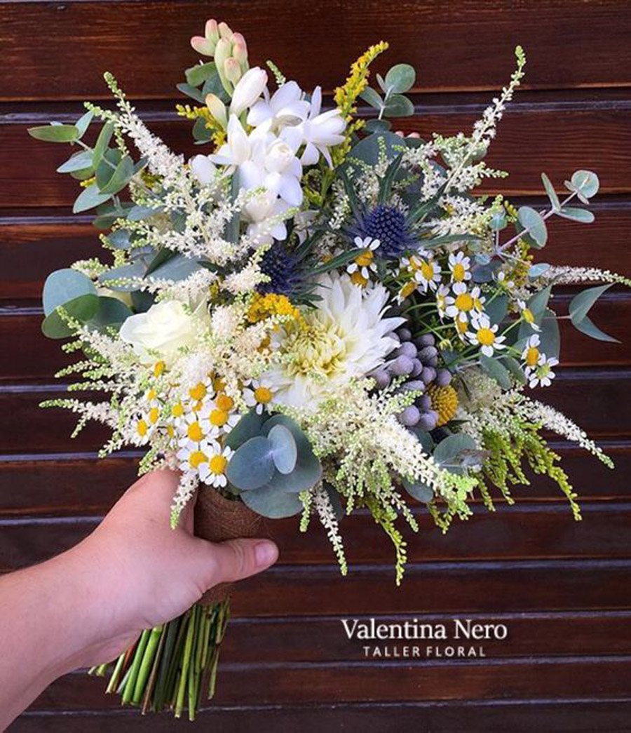 El nardo, conocido también como vara de San José, es una flor de temporada que florece en primavera-verano muy típica de nuestra tierra y aunque nos pueda dar la sensación de ser una flor muy castiza, tiene su origen en México. Sus flores, blancas o rosadas, se agrupan en forma de espiga y destacan por su agradable fragancia, de hecho, una de las principales características del nardo es que es capaz de seguir desprendiendo su olor hasta dos días después de haber sido cortado. Recuerda un poco al aroma del jazmín o del azahar aunque el del nardo es más afrutado y meloso. Es una especie muy elegante que aporta un sello muy especial y funciona muy bien en bouquets con tallos largos o en combinación con otras variedades florales o mucho verde, aunque hay que saber combinarlos intentando que las flores que los acompañen no sean también muy aromáticas. Por ejemplo, unas Freesias entrarían en conflicto con los nardos si están en el mismo ramo ya que también son muy olorosas. En cambio una combinación perfecta, si queremos dar al ramo un cierto aire silvestre, podría ser la de nardos, trigo y astilbe. Pero si buscamos una estética más clásica o romántica, las rosas serían las flores ideales para acompañarlo. Yo particularmente ya sabéis que sigo la máxima de ‘menos es más’ y, en este caso, un sencillo ramo de novia confeccionado únicamente con nardos me parece una opción preciosa y muy natural que además es perfecta para cualquier estilo de boda. Espero que os guste la idea y os animéis a lucir uno el día de vuestra boda.