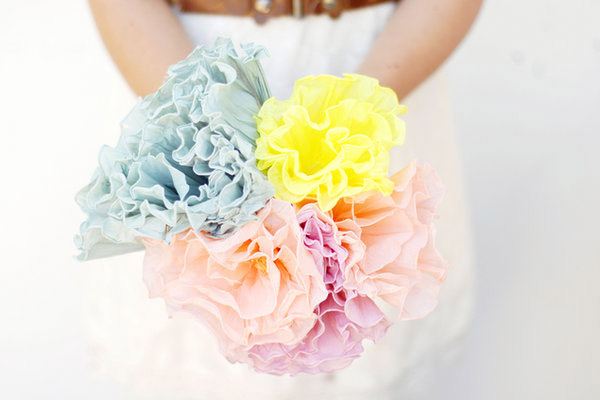 Seguro que muchas de vosotras, sobre todo las ya casadas, habéis pensado alguna vez que os hubiera gustado que vuestro ramo de novia perdurase eternamente. Por suerte, el mercado cada día nos sorprende con algo nuevo y en la actualidad ya existen técnicas para conseguir que las flores naturales se conserven durante más tiempo y tarden en marchitarse. También se han puesto muy de moda los ramos artificiales confeccionados con tela, fieltro, lana o incluso papel. Y, aunque es cierto o al menos a mí me lo parece, que nada puede sustituir a una flor natural, he de reconocer que hay artesanos que hacen auténticas obras de arte con los bouquets de novia. Pero como no todos somos unos manitas hoy os traigo un tutorial que me ha parecido tremendamente sencillo y muy práctico porque además de dar solución a la idea de conservar el ramo de novia, podéis también aprovecharlo para confeccionar ramos para vuestras madres, amigas o damas de honor, empleando menos flores o haciendo bouquets de menor tamaño pero combinando los colores para que hagan juego con el vuestro. Es increíble lo que se puede lograr con el papel crepé o papel de Pinocho, como se le conoce normalmente.