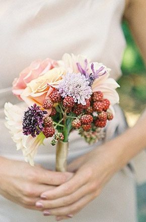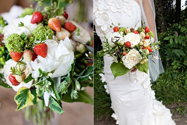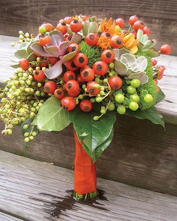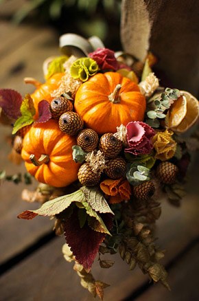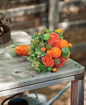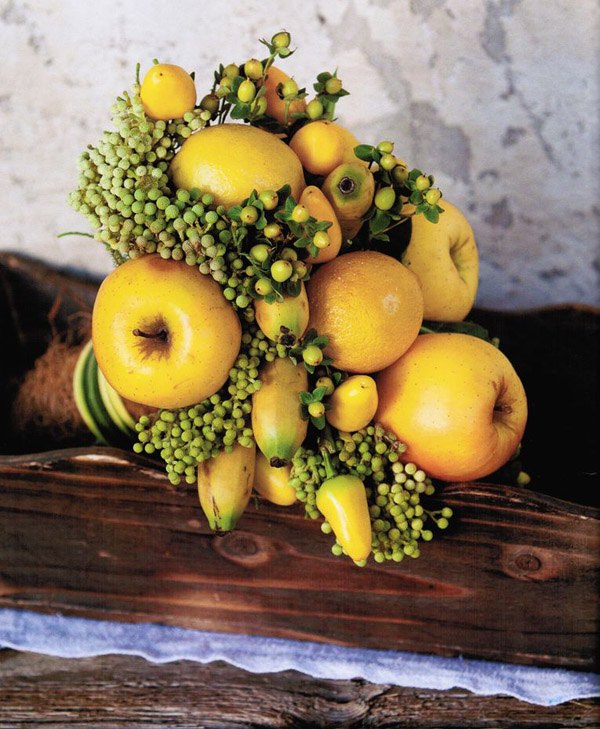 Ahora que empieza a cambiar el tiempo y que dejamos atrás las bodas de verano para dar paso a las de otoño, voy a intentar traeros ideas y detalles más propios de esta época del año para que todas las que os casáis en los próximos meses, que me consta que sois cada vez más, podáis utilizar en vuestra boda. Buscando siempre detalles originales y diferentes, me encontré no hace mucho con un ramo de novia que llamó mi atención, prácticamente no tenía flores y, en su lugar, habían dispuesto de forma muy creativa diferentes frutas de temporada. Me gustó mucho la idea, así que buceé por la red en busca de más ramos similares y hoy os dejo con la selección de todos los que encontré. La verdad es que es una bonita opción para una boda de otoño porque en esta época las frutas tienen esos colores ocres y rojizos que bien combinados pueden dar una nostálgica nota de color al bouquet. Podéis utilizar naranjas, manzanas, frutos del bosque y combinarlos con flores, ramas, musgo e incluso algún elemento vegetal o de temporada, como la calabaza. Eso sí, intentad que la mezcla sea armoniosa y si tenéis dudas consultad antes con un profesional que os indicará qué tipo de flor y de fruta es la más idónea en función de la época del año.