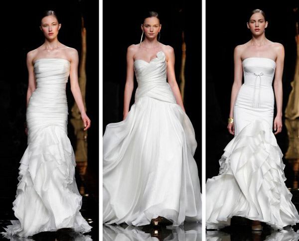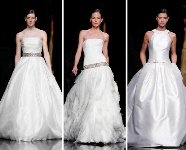 Blanco y Oro será la combinación perfecta de la novia Rosa Clará para la próxima temporada. La diseñadora catalana volvió a enamorar con sus vestidos nupciales presentando una colección variada y rica en siluetas y tejidos. La seda, el satén, el tul, la organza o el encaje chantilly destacaron sobre las formas sinuosas de las modelos. Como punto diferencial, la nueva colección se ha dividido en tres grandes líneas: SOFT (con vestidos de gran caída en blanco y nude, ceñidos al cuerpo resaltando la figura), VOLUMEN (con trajes de talles altos o bajos con cuerpos escuetos, cinturas muy marcadas y faldas de gran volumen) y MINIMAL (trajes sobrios con amplias faldas combinadas con cuerpos muy simples inspirados en T-shirts de escotes asimétricos o espaldas descubiertas). Respecto a los colores, el blanco, el nude y el oro forman un trío ganador, en el que destaca principalmente este último presente también en cinturones-joya y en zapatos y cinturones de charol. Particularmente eché de menos algún modelo con falda corta, tan presente en la anterior temporada y totalmente olvidada en la nueva. Pero, por otro lado, he de decir que me encantó el detalle de uno de los modelos formado por una falda pantalón, que de frente daba la impresión de ser un pantalón ancho y de espaldas se mostraba como una falda con vuelo incluido. Una vez más, Rosa Clará triunfó sobre la pasarela.