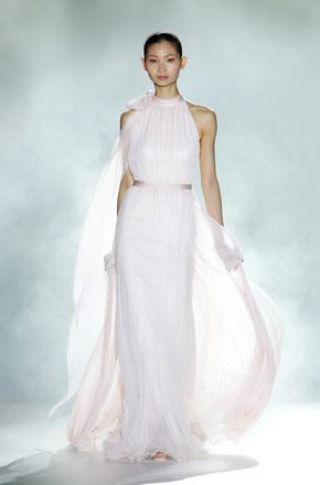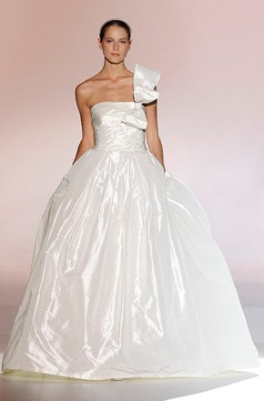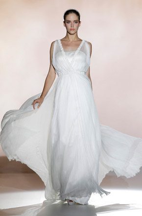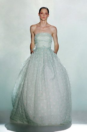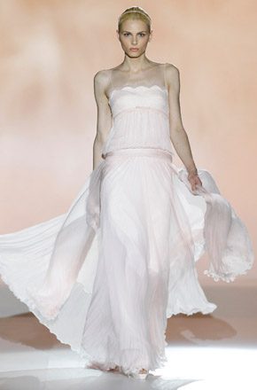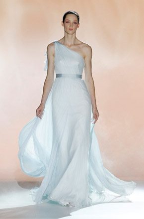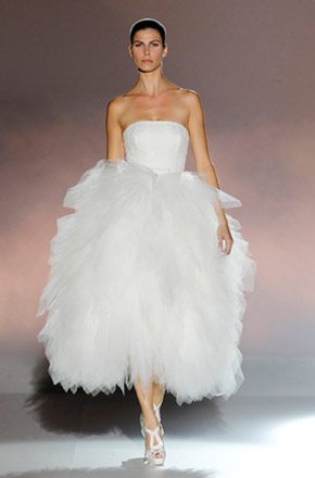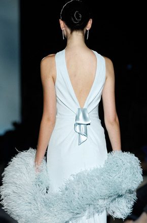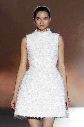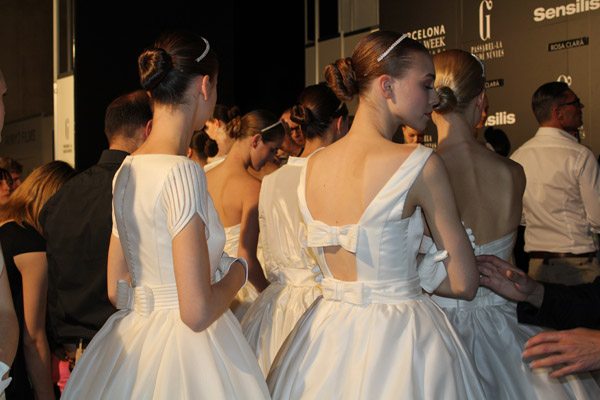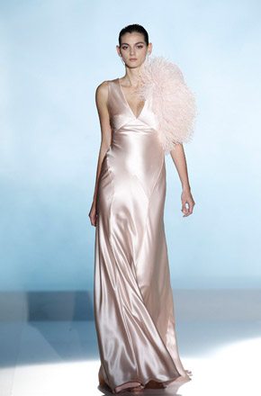 Marcado por la polémica surgida en torno al top model bosnio de nacionalidad australiana, Andrej Péjic, Rosa Clará abrió la Barcelona Bridal Week con un desfile teñido por los colores cupcake como el rosa pastel, el verde aguamarina o el azul cielo, unidos en tres líneas diferentes bajo un mismo denominador común: la elegancia y feminidad tan característica de la marca. Vestidos plisados en gasa y tul de seda que consiguen un movimiento vaporoso. Rasos satinados de líneas rectas y faldas de gran caída combinadas con flores y plumas. Variedad de volúmenes intercalando faldas voluminosas con líneas tipo sirena o vestidos cortos. Y, la gran novedad de este año, la aplicación de los tejidos de fantasía sobre los vestidos de novia con flores bordadas de organza. Respecto a los accesorios, estos se combinan en función de los tejidos y del particular estilo de cada modelo, destacando así pendientes con piedras de colores o diademas de la misma tonalidad que los trajes. Mención especial merecen las chaquetas de flores y las estolas de plumas confeccionadas en los mismos colores de la colección, tan años 50 y que siguen siendo tendencia sobre la pasarela. A mí personalmente me encantan, creo que son el complemento perfecto para dar un aire chic a un vestido de novia. Una vez más Rosa Clará no decepcionó a los más fieles a pesar de su arriesgada apuesta al confiar el peso de su imagen en Andrej Péjic, que dotó al desfile de un aire andrógino que pudo gustar o no pero que, con total seguridad, no dejó indiferente a nadie. La crónica del cocktail-fiesta, bien merece un post aparte.