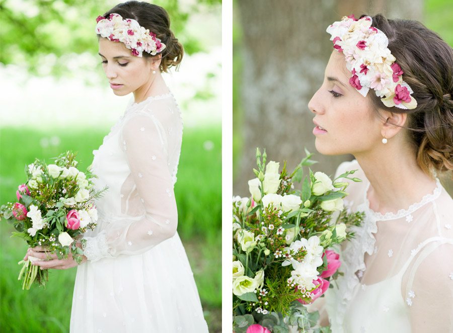 Me encantan las sesiones de inspiración de estilo rústico producidas al aire libre y que respiran frescura y naturalidad. La que hoy os traigo se inspira en una flor silvestre que seguro que habréis visto en más de una ocasión, la Yellow Bell, conocida así por la forma acampanada de sus pétalos. Esta pequeña florecilla estuvo presente como fondo durante prácticamente toda la sesión, realizada en un paraje natural en el increíble marco del valle de Sakana, entre las Sierras de Aralar y Urbasa. Un roble centenario y una bicicleta vintage, junto a los preciosos tocados diseñados por Ana Turón de Tocados Mariana y los vestidos de Alicia Rueda, pusieron la guinda estética ideal para vestir a una novia de campo. Ana confecciona tocados, coronas y diademas 100% artesanales y personalizados, su pasión por las flores naturales la llevó a este mundo del diseño floral donde cada uno de sus modelos es diferente, no existen dos iguales. Los materiales que utiliza en sus coronas son flores artificiales de alta calidad combinadas con flores preservadas, consiguiendo así la conservación de cada pieza y dotándolas de un aspecto muy natural. Para la sesión, la diseñadora confeccionó modelos exclusivos de aire campestre con un toque bohemio para adaptarlos al estilo de la editorial y a los vestidos de Alicia Rueda, el primero de ellos ambientado en el estilo de los antiguos colonos americanos y confeccionado en organza de seda bordada con flores de puntilla de algodón y el segundo, de aire boho y manga larga, confeccionado en un voile bordado en figuras geométricas con volante en cola y corte en cintura con ligero fruncido. La combinación de vestido más tocado dio como resultado un estilismo campestre muy natural perfecto para una novia que busca la sencillez y la frescura de los detalles más cuidados.