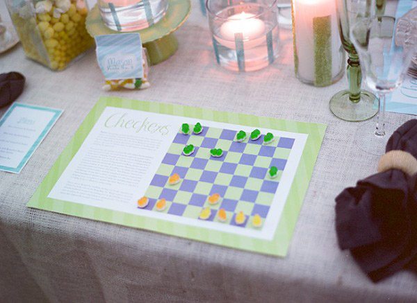 En ocasiones, cuando vamos a comer fuera, sucede que los platos tardan en llegar y que la espera entre uno y otro se nos hace tremendamente larga y aburrida. Aunque eso no suele ocurrir en las bodas, ya que normalmente los tiempos están muy marcados por el servicio, sí que cuando éste se corta debido a un parlamento de algún familiar o amigo de los novios o por la entrega de los detalles a las mamás o papás, podemos encontrarnos entre plato y plato con un tiempo de espera ‘inesperado’. Para amenizar esta espera hoy os traigo una idea dulce y divertida, consiste en dejar bajo los platos unos mantelitos de papel en los que habrá impreso un tablero de damas y unas bolsitas con gominolas de dos colores en su interior. Las bolsitas os pueden servir incluso como sitting, ya que en ellas podéis imprimir el número de la mesa y el nombre del invitado que corresponda. También es una idea divertida para dejar en la mesa de los niños invitados a la boda, ya que es una manera de tenerlos entretenidos durante la comida. Espero que os guste.