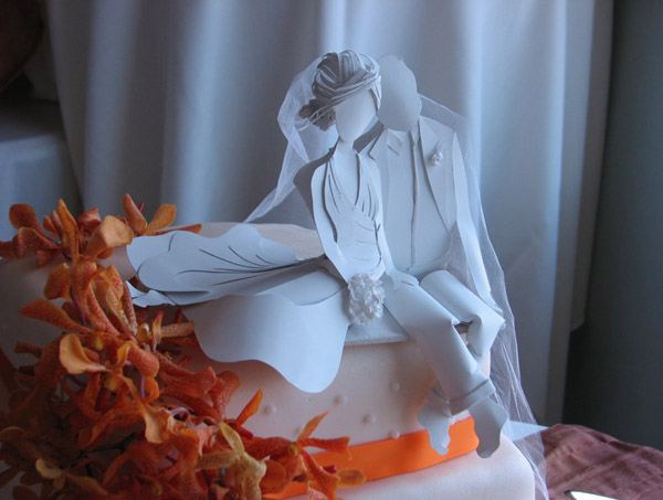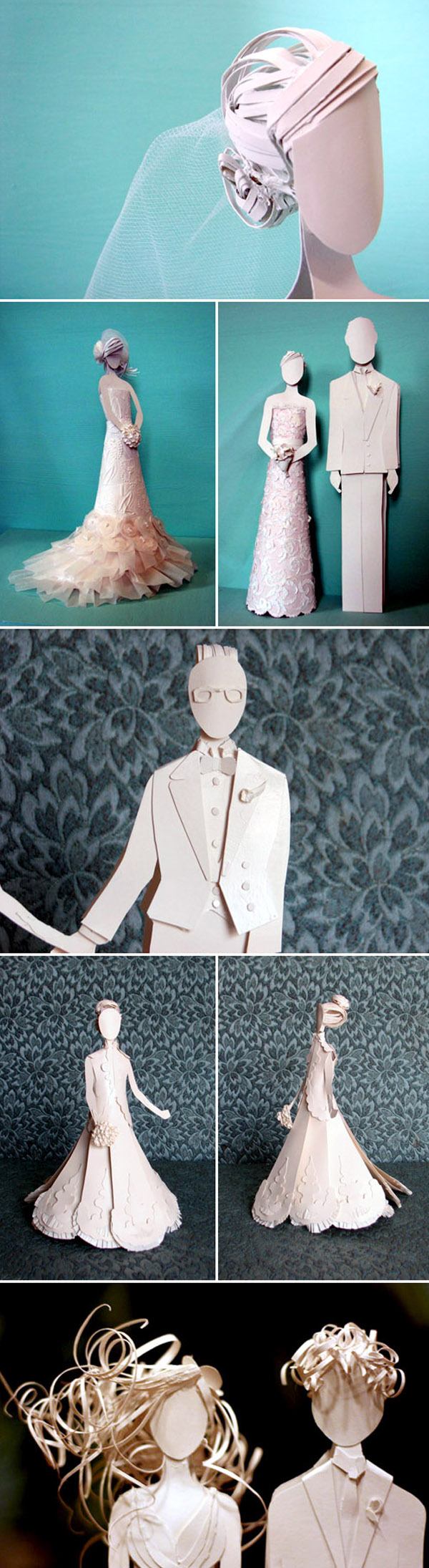 ¡Es increíble lo que puede hacerse con un simple pedazo de papel! Bueno, y con mucha maña e imaginación por supuesto. Navegando por la red me encontré con estos muñecos para el pastel de bodas realizados en papel y totalmente personalizados. A pesar de no tener rostro, sus creadores centran los detalles en el vestido y en el peinado de los novios y la verdad es que son de un realismo asombroso. Llama la atención el detalle minucioso que ponen en el tipo de peinado de la novia, tanto con el pelo suelto como recogido y con el velo incluido, y en la forma y tela del vestido, intentando plasmar cada pliegue, cada volante y cada costura. Me ha parecido genial, además de diferente.