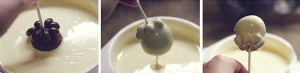4. Cuando esté solidificado el chocolate que une los conguitos a la bola, cubrimos todo el cakepop con chocolate blanco.