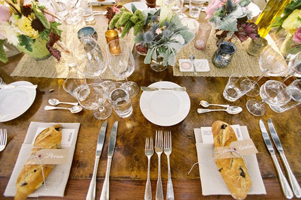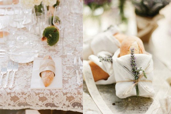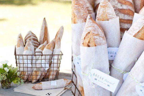 Mi abuela siempre decía que el pan nunca podía faltar en una mesa a la hora de comer, quizás por eso me gusta tanto. Y creo que, como siempre, tenía razón. Ahora que llevo unos días a dieta creo que es de los alimentos que más me ha costado prescindir y es que a mí el pan me gusta de cualquier tipo, tamaño y gusto, cuanto más variado más divertido: de ajo, de olivas negras, de nueces, de cebolla, de coca… si por mi fuese podría sobrevivir comiendo solamente pan. En una boda el pan también puede convertirse en imprescindible, pero no sólo como parte del menú, también podéis darle otros usos igual de importantes y mucho más originales. A mí particularmente me gusta mucho la opción de ofrecerlo como regalo a vuestros invitados, acompañado por ejemplo de un tarrito de confitura o de miel, me parece una idea muy artesana y natural, además de práctica, perfecta para una boda rústica. También podéis utilizarlo como sitting de mesa, cubriéndolo con un paño bonito de cuadros o incluso de ganchillo, atado con una cuerda o cinta que sujete una tarjeta con el nombre de cada invitado. La idea de incluirlo en la recena también me parece ideal. Podéis ponerlo en el interior de una cajita individual y personalizada, tipo ‘pack de supervivencia de medianoche’ con un poco de fruta, quesos variados y diferentes tipos de pan, ¿no os parece una idea genial para una boda al aire libre? Seguro que después de unas horas de baile más de un invitado os lo agradecerá. Sea como sea, el caso es que, como decía mi sabia abuela, el pan no debería faltar en vuestra mesa de boda.