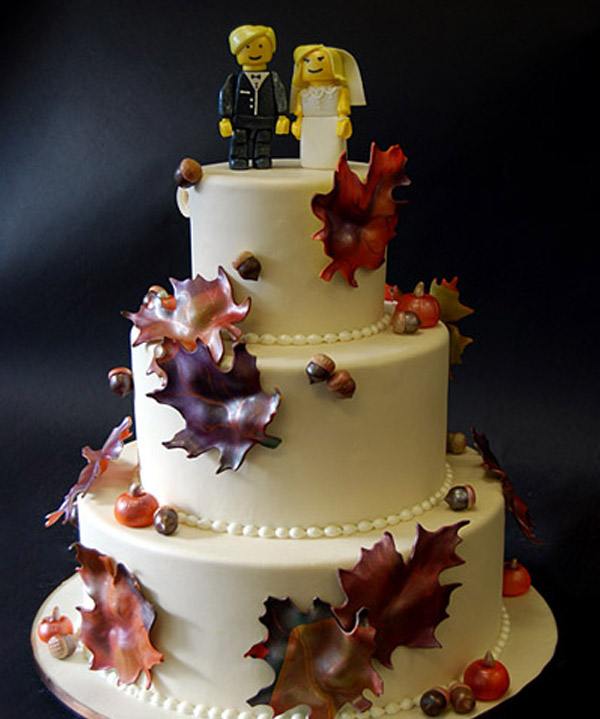 Esta semana hemos hablado de los divertidos muñequitos de LEGO como idea original para colocar sobre el pastel de vuestra boda. Si todavía queréis rizar más el rizo, os propongo que acompañéis la anterior idea con la que os traigo hoy: un pastel de bodas hecho con figuras de LEGO de chocolate. Si vemos el pastel de frente únicamente apreciamos una bonita decoración otoñal con hojas caídas, bellotas, calabazas y una pareja de novios de LEGO en la parte superior, pero si lo vemos por detrás se descubre realmente el pastel (nunca mejor dicho) y muestra el simulacro de figuras de LEGO con las que se ha ‘construido’ la tarta. Aunque lo mejor, tratándose de un pastel de bodas, son sus ingredientes: crema de Chambord de frambuesa, chocolate con Oreos y crema de nata y Graham con chocolate y crema de vainilla. ¡Para chuparse los dedos!