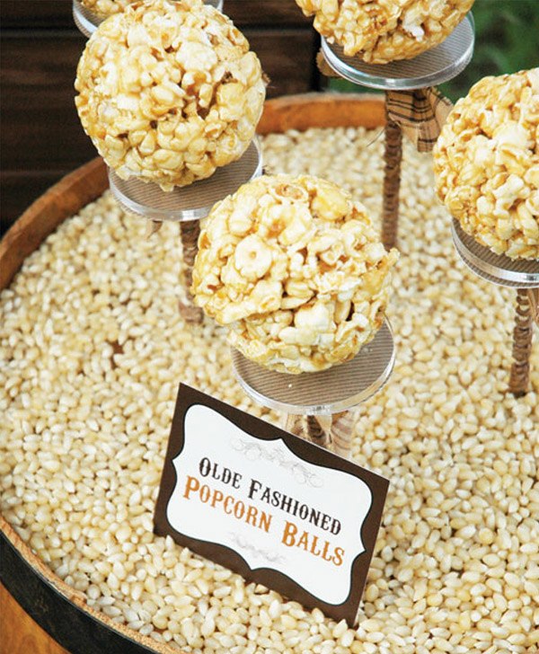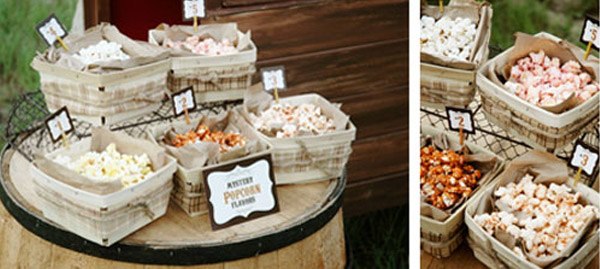 La idea de poner una máquina de palomitas en las bodas ya empieza a ser algo frecuente en nuestro país pero, como todo, hay muchas maneras de presentar una idea que a primera vista puede parecer muy simple pero que con un poquito de creatividad puede llegar a convertirse en el centro de atención del aperitivo o la recena. Hoy os propongo un Popcorn Bar de estilo rústico-vintage. Si os fijáis, la decoración es primordial pero tanto o más importante es la presentación. Podemos conformarnos con poner una parada de palomitas como las que vemos en las ferias o podemos ir un poco más allá y convertir unas simples palomitas en algo realmente apetecible. Hasta que no vi la idea nunca pensé que a las palomitas se les podría condimentar con algo más que no fuera sal o mantequilla pero, qué equivocada que estaba… Las palomitas que ilustran el post, además de los ingredientes que os he comentado también están aliñadas con azúcar, canela, lima e incluso con queso cheddar. Podéis añadir también varios recipientes con chocolate o cacahuetes para combinarlos con las palomitas. Y para los más pequeños se han creado unas bolas de palomitas de maíz con caramelo a modo de chupa-chup, con palo incluido para que puedan comérselas sin mancharse. ¿No os parece una idea genial? También podéis jugar con el efecto sorpresa y colocar diferentes variedades de palomitas con distintos sabores. En este caso, se colocaron cinco variedades-sorpresa (sal y vinagre, barbacoa, sandía, mantequilla de cacahuete y tacos), cuyo sabor se descubría una vez los invitados abrían las bolsas. El invitado que acertara correctamente los cinco sabores tenía un premio. Como veis, a veces una idea básica puede dar lugar a otras que acaban transformando un espacio o una situación. ¿Os animáis a poner un Popcorn Bar en vuestra boda?