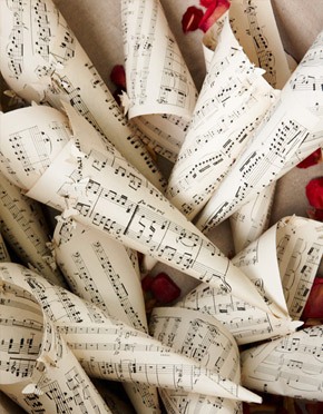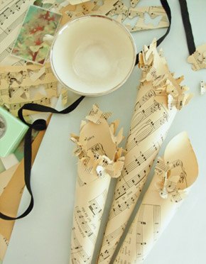 Hoy os traigo una idea que me ha parecido preciosa, sencilla, elegante y muy fácil de realizar por nosotras mismas con muy poquito dinero. Se trata de un detalle muy bonito donde guardar los pétalos de flores, el confetti o el arroz que los invitados tirarán a la salida de los novios de la iglesia o del lugar donde se haya celebrado la ceremonia. Son unos conos hechos con papel envejecido tipo partitura musical. Para confeccionarlos necesitas: 1.- Una perforadora de papel con forma de mariposa, aunque cortarlas a mano también vale. 2.- Una partitura o un papel envejecido con el dibujo impreso. 3.- Pasta de pegamento. 4.- Purpurina o escarcha. 5.- Unas tijeras. 6.- Una pinza para tender la ropa. 7.- Pegamento blanco.