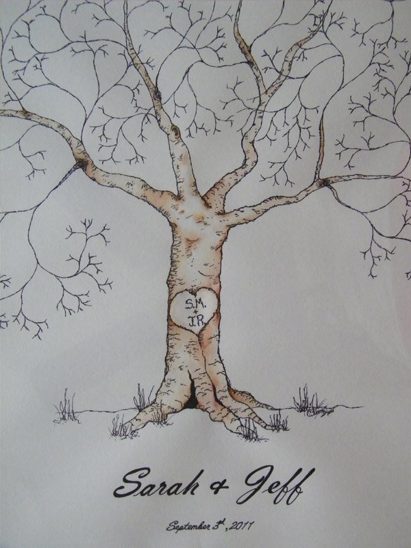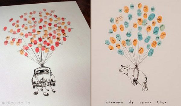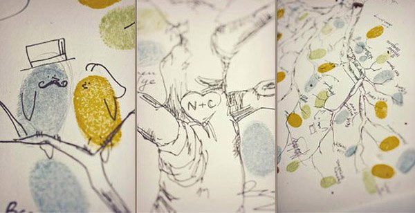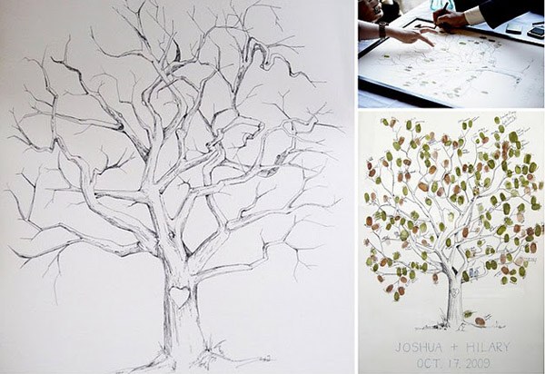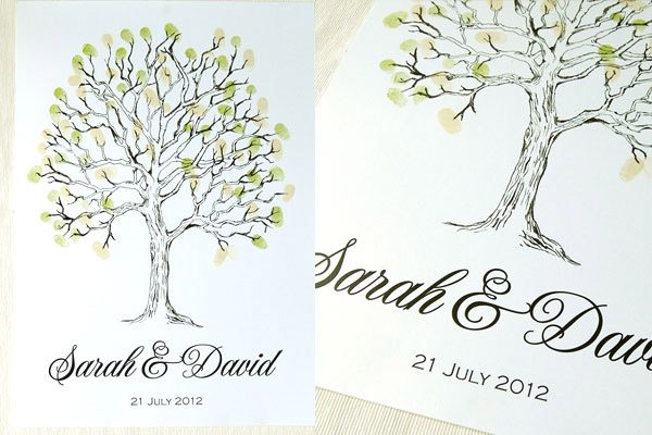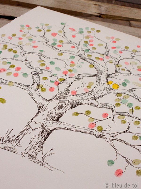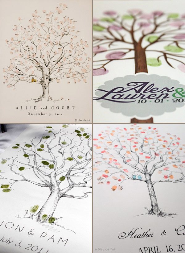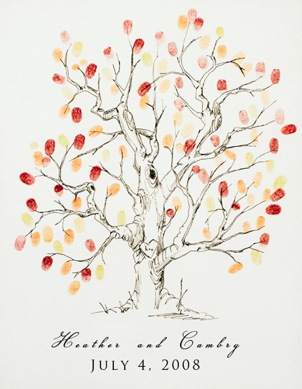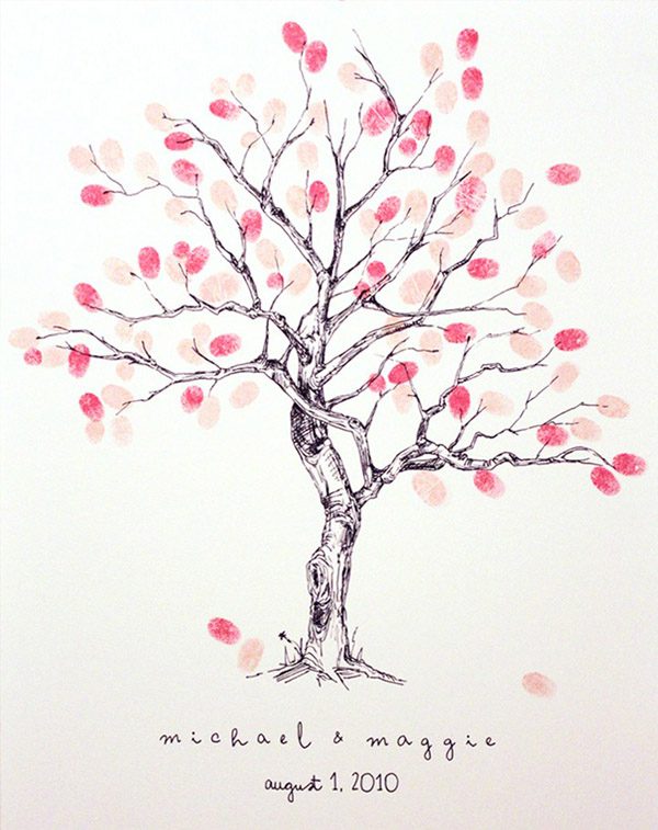 Hace días que quería dedicar un post a los Árboles de Huellas, es una idea alternativa al tradicional Libro de Firmas que me encanta. Y es que no todo el mundo sabe qué decir o qué escribir cuando llega el momento de dedicar unas palabras a los recién casados así que el Árbol de Huellas es una opción más práctica y al mismo tiempo más artística. Por si todavía hay alguien que no sabe qué es, se trata del diseño de un árbol con ramas pero sin hojas, que podéis colocar sobre una mesa o en un lugar visible de la boda junto a varias almohadillas de tinta de uno o varios colores para que vuestros invitados puedan imprimir sobre él sus huellas (a modo de hojas) y, de esta forma, crear una composición ideal para guardar como recuerdo e incluso decorar vuestro futuro hogar. Vuestros invitados pueden dejar únicamente su huella o poner además su nombre en pequeñito junto a ella, para que podáis identificarlas. Hay cientos de diseños y no tiene por qué ser siempre un árbol, aunque a mí la idea de dibujar un sauce llorón me parece súper romántica, pero también podéis escoger otras imágenes como un ramillete de globos, flores o lo que más os guste. Si os decantáis por el diseño del árbol también queda precioso si lleva grabado un corazón en el tronco, que podéis aprovechar para poner las iniciales de los novios o la fecha de la boda. Después sólo es necesario enmarcarlo y ya tenéis un recuerdo para toda la vida.
