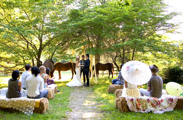 Fue uno de los detalles que me hubiera encantado poner en mi boda pero que por problemas de logística al final no pudo ser, aunque no por ello me han dejado de gustar, al contrario, las considero una decoración ideal para una boda rústica. Si habéis decidido casaros en un entorno rural puede que no os resulte difícil encontrar las alpacas o balas de paja, aunque debéis tener en cuenta su traslado, la colocación y que sueltan bastante paja si las mueves, así que después de colocarlas tendréis que barrer el espacio para que a la hora de la ceremonia quede perfecto. Podéis darles muchos usos, el meramente decorativo destacando un lugar determinado, como fondo de ceremonia, emplearlas en substitución de las sillas o bancos, para decorar una zona de descanso concreta o incluso un chill-out… Si vais a usarlas para que los invitados puedan sentarse sobre ellas, lo mejor es que coloquéis telas o cojines en la parte superior, ya que la paja es bastante molesta y puede dañar los vestidos, en este caso os podéis decidir por usar una tela del mismo color o colocar telas de diversas texturas y colores, quedará muy divertido. En las fotografías podéis ver diferentes ejemplos para su utilización, seguro que más de una querréis incorporarlas en vuestra boda.
