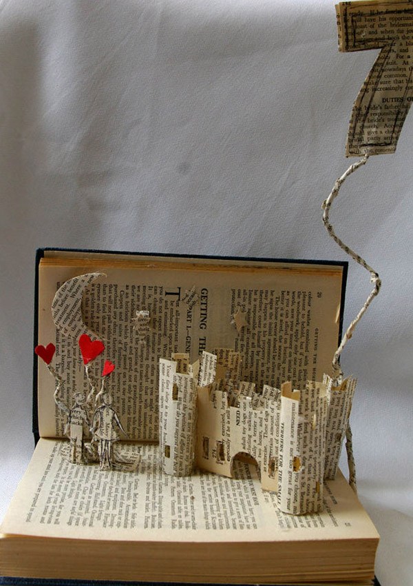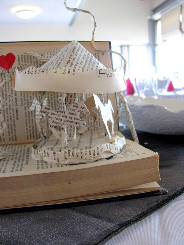 Clare y Paul son dos artistas enamorados que quisieron que su boda reflejase su personalidad y su interés por el arte y la música. La novia suele colaborar como artista en la comunidad donde residen y quiso, desde el principio, hacer de forma artesanal todo lo que pudiera para su boda. Y Paul, por supuesto, la acompañó. No os voy a hablar de todo lo que llegaron a producir pero sí de algo que llamó mi atención de inmediato: sus originales centros de mesa. Para su realización utilizaron recortes de papel de libros antiguos mediante los que representaron pequeñas escenas de su vida en común situadas sobre el soporte de otro libro, a modo de escena teatral. Del interior de cada uno de ellos salía un soporte, también de papel, con el número de mesa. La verdad es que el resultado fue una auténtica maravilla y una pequeña obra de arte que dejó boquiabiertos a todos los invitados. Es increíble lo que puede llegar a hacerse con unos pequeños pedazos de papel y una alta dosis de creatividad. ¿Os animáis?