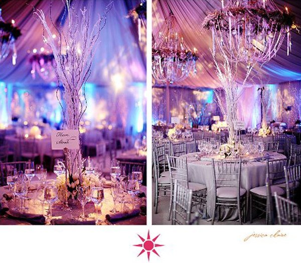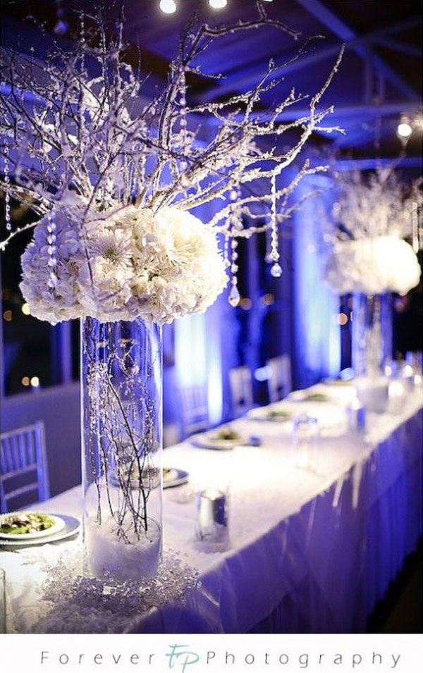 En plena temporada de bodas de invierno aprovecho esta última semana que nos queda antes de las vacaciones de navidad para daros algunas ideas a todas las que habéis decidido casaros en esta época tan entrañable. Creo que si me casase otra vez lo haría en invierno. Siempre me han gustado más las bodas de primavera o verano por el hecho de que se pueden utilizar mucho mejor los exteriores y porque el clima invita a disfrutar del aire libre, pero me hubiera gustado tener una segunda boda en invierno, algo así como una segunda parte de la de verano, un ‘continuará en invierno’… La navidad es una época del año que invita a recogerse frente a una chimenea, a disfrutar en familia de una buena comida y de un buen fuego, una época de reencuentros, de amistad, de pura simbología, por eso me parece perfecta también para casarse. Si tenéis pensado dar el ‘sí quiero’ a pesar del frío o incluso de la nieve, hoy os traigo algunas ideas para decorar vuestros centros de mesa. Podéis darles un aire navideño con algún elemento tradicional de la época como unas bolas de navidad, muérdago o unas ramitas de acebo o podéis jugar con la decoración floral transformándola con algún efecto especial como la escarcha o el polvo de nieve para dar más ambiente. También las velas son un elemento importante ya que aportan calidez e intimidad a la mesa, los juegos de luz siempre dan un resultado espectacular y si los incorporáis al centro de mesa todavía llamarán más la atención. Están muy de moda los centros de mesa altos, con forma de copa o incluso de árbol, de los que podéis colgar pequeñas velitas o collares de cuentas de cristal que potenciarán el reflejo de la luz creando un juego de luces y sombras sorprendente y muy visual. Espero que encontréis inspiración en las imágenes.