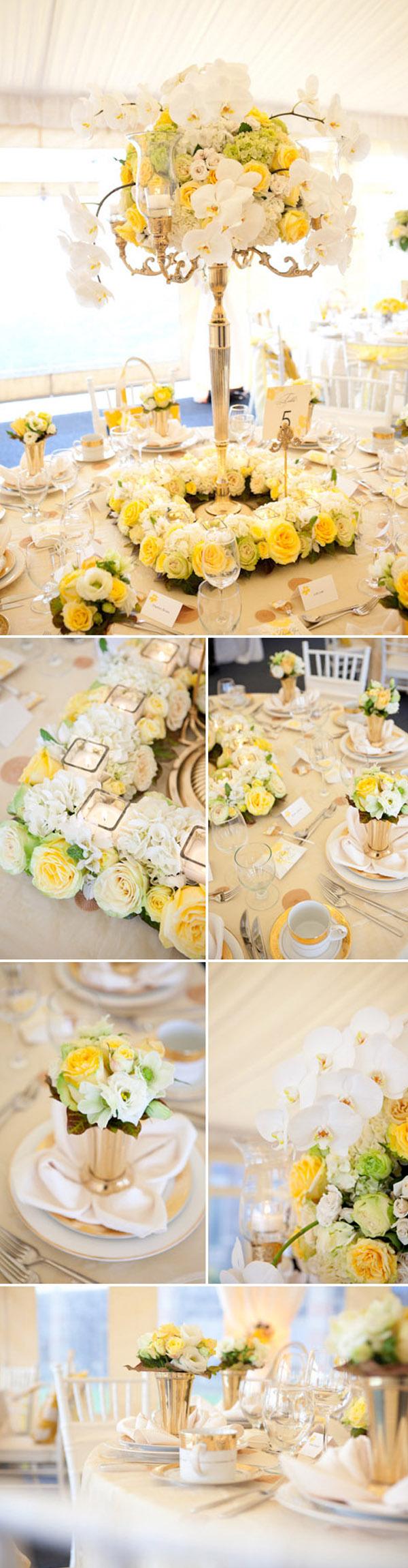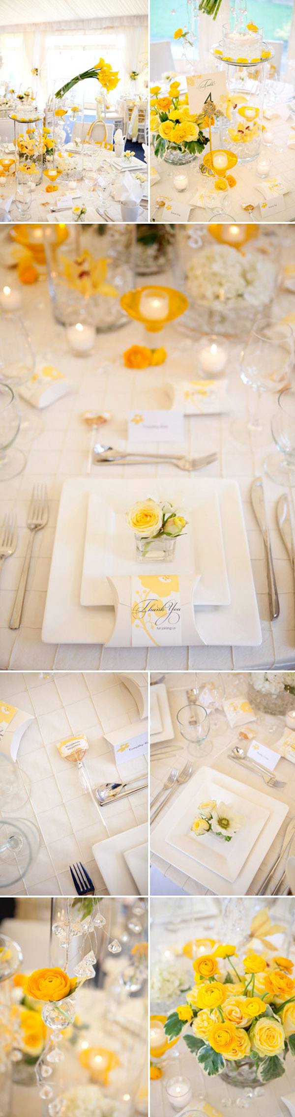 No es que quiera rendir homenaje al modelito que lució la reina Isabel II en la boda de su nieto Guillermo, pero la verdad es que el amarillo es uno de los colores que están más de moda este verano. Si no eres una novia supersticiosa y te gusta este color, te invito a descubrir diferentes opciones para la decoración de mesa. En contra de lo que pueda parecer da mucho juego y combinado con detalles en blanco y con elementos decorativos de cristal transparente dulcifica mucho más su efecto, haciendo que el ambiente no se vea tan recargado. ¿Alguien se atreve con el amarillo limón?