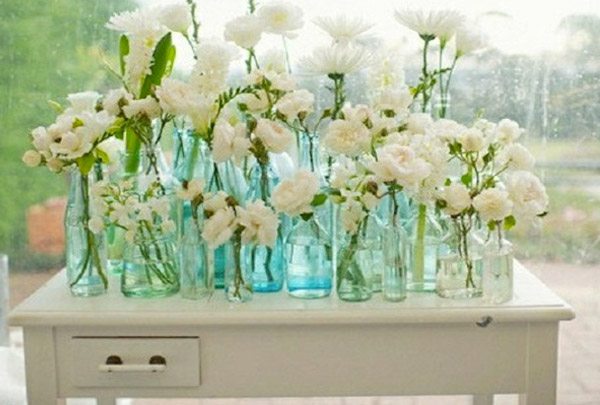 Últimamente me estoy volviendo una coleccionista compulsiva de botellas de cristal, me gustan de cualquier forma, modelo o color, transparentes, opacas, de boca ancha, con grabados imposibles, estilizadas o chatas, no hay modelo que se me resista. Salgo de los restaurantes como una fugitiva con la botella de agua metida en el bolso e incluso he llegado a pedir que me envuelvan para llevar la botellita de moscatel con forma de corazón que acompañaba el postre el día que le regalé a mi marido su reloj de ‘prometido’. El caso es que me gustan y me declaro fan total de ellas, además las encuentro perfectas para decorar cualquier estancia y, por supuesto, una boda. Si habéis pensado tematizar la decoración empleando un color concreto podéis jugar con las diferentes tonalidades que ofrece la transparencia del cristal, os dará mucho juego y el resultado puede ser espectacular. También podéis utilizar la ‘decoración suspendida’, colocando botellas de diferentes tamaños y modelos colgadas a distintas alturas desde el techo, las paredes, un árbol o cualquier otro soporte que se encuentre relativamente alto. En este caso podéis colocar en su interior una única flor de color blanco si queréis dar a la decoración un aire minimalista o pequeñas flores silvestres de diferentes colores para conseguir un look más bohemio. Utilizar botellas para el centro de mesa también puede ser una solución económica y llamativa, sólo tenéis que colocar una base en función del estilo de la boda (de madera si se trata de una boda rústica, de metal si es una boda minimal, con arena de playa si la temática es el mar…) y poner sobre ella una o varias botellas que podéis adornar con flores o con algún complemento como tela o blonda. Otra idea original es utilizarlas como sitting colocando tarjetitas con el nombre de los invitados escritos en ellas, las podéis dejar directamente sobre la mesa o todas juntas para que sea el propio invitado el que busque su nombre y se lo lleve a su sitio. Luego, la misma botella puede acabar siendo el regalo para el invitado. Como veis el juego que dan las botellas de cristal es múltiple y variado y lo mejor es que con poco dinero podéis llegar a conseguir una decoración de gran impacto visual.