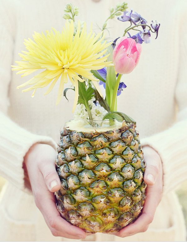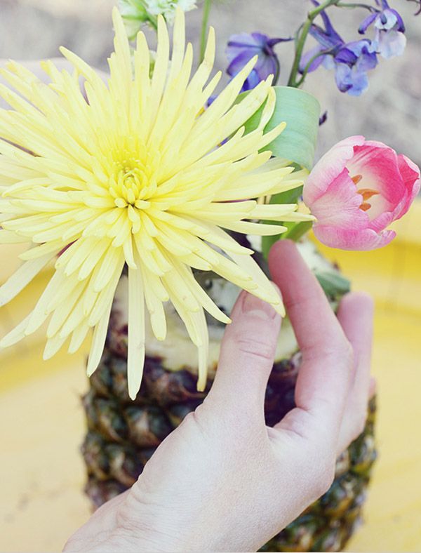 Se acercan las bodas de verano y hay que ir pensando en todos los detalles. Hoy os traigo un tutorial para que podáis haceros vuestro propio centro de mesa con un aire muy tropical y veraniego. Para el de la muestra se ha elegido una piña pero podéis hacer diferentes versiones cambiando tanto de base como de relleno, se puede poner una base de melón, de sandía e incluso de mango y en lugar de flores utilizar velas votivas o cítricos. También podéis decantaros por poner un único elemento central de gran tamaño o varios más pequeños y combinados sobre un mismo recipiente.