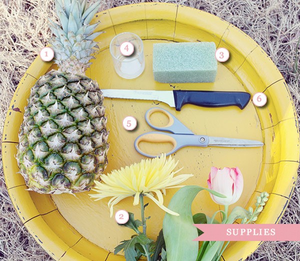 Vais a necesitar: 1.- Piña natural. 2.- Flores variadas. 3.- Espuma floral. 4.- Recipiente para velas votivas. 5.- Tijeras. 6.- Cuchillo.