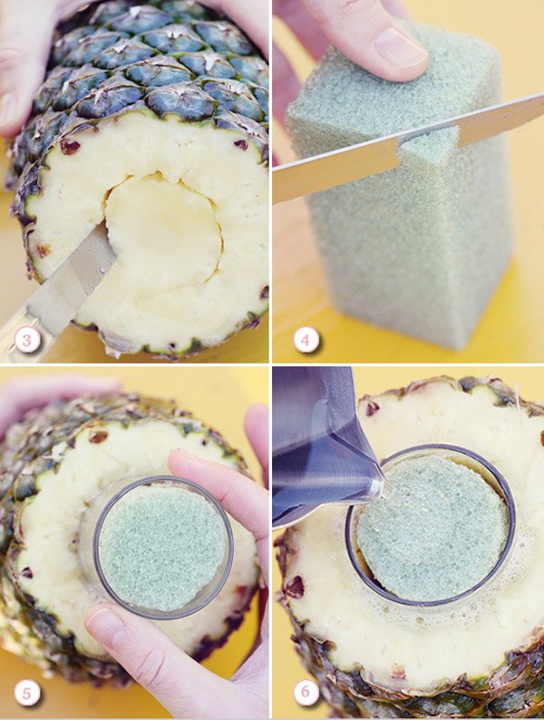 5.- Colocar el recipiente con la espuma floral en el interior del hueco de la piña.