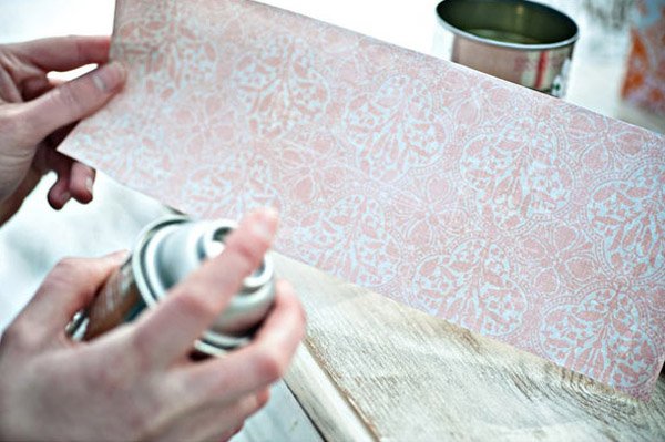 2.- Recortar el papel y poner una fina capa de spray adhesivo sobre él, esperar unos segundos antes de engancharlo a la lata.