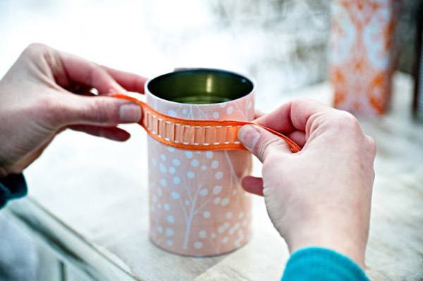4.- Recortar un trozo de cinta y pegarla sobre el papel alrededor de la lata. Podéis utilizar diferentes cintas de distinto color o textura y colocarlas a diferentes alturas de la lata.