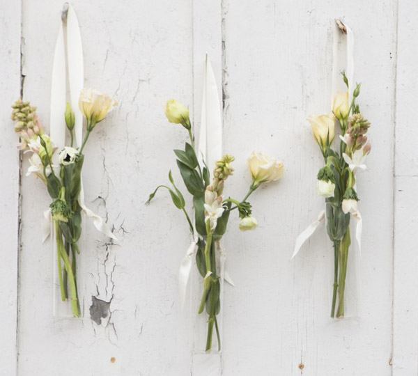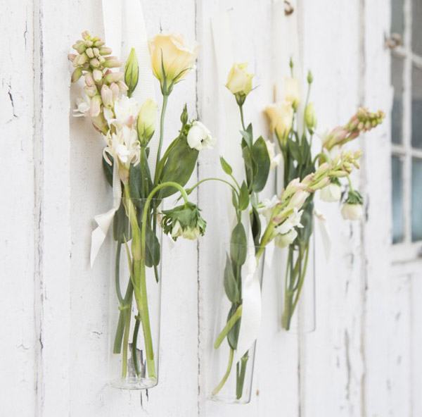 Seguro que todos tenemos ya ganas de primavera, de flores, de naturaleza y por supuesto, de bodas al aire libre, que ya está bien de tanto frío y temporales. Pues para ir preparando la llegada del buen tiempo he buscado un tutorial donde las flores son las protagonistas. Ya sabéis que una de mis máximas es ‘menos es más’, así que cuanto más sencillo resulta un arreglo floral más impacto causa en las personas que lo ven. Hace tiempo ya os hablé en otro post de la Decoración Suspendida, una forma diferente de decorar cualquier espacio dirigiendo el punto de atención a las ‘alturas’, hoy nuestro DIY consiste precisamente en la elaboración de un centro floral en suspensión. Cuesta muy poquito de hacer y seguro que encontráis un lugar idóneo en vuestra boda para darle el protagonismo que merece, ya que tanto os puede servir para decorar una pared, como una mesa o incluso las ramas de un árbol porque la idea de poder colgarlos en cualquier sitio los hace más prácticos si cabe. Para ello vais a necesitar: varios jarrones/tubos de cristal transparentes con dos orificios a ambos lados (en Amazon podéis encontrar unos similares), cinta de raso, tijeras normales y de poda y varias piezas florales.