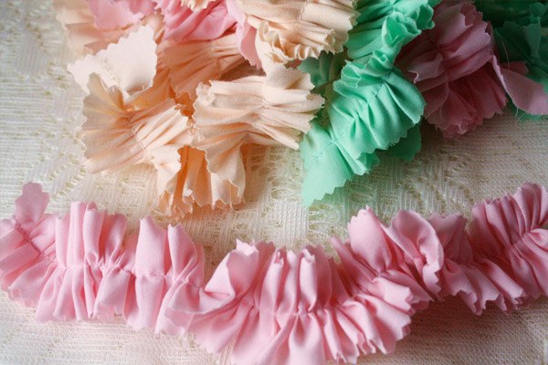 1. Cortar la tela de algodón en tiras de 1 metro de largo x 4cms de ancho con tijeras dentadas. Coser por la parte central de cada tira arrugándola a medida que se va cosiendo para darle la forma de volantes. Cada volante debe hacer unos 20cms de largo.