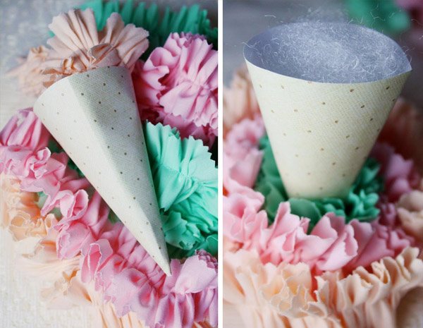 4. Poner pegamento caliente alrededor del borde interior del cono y pegar la bola en su interior. Luego, con ayuda del mismo pegamento, ir pegando los volantes de tela alrededor de la parte superior del cono.