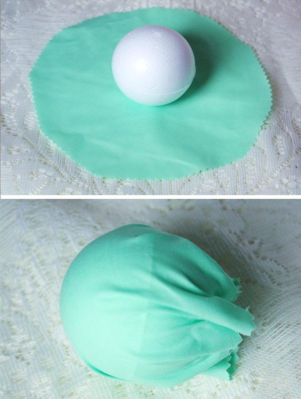 3. Cortar un círculo de tela de aproximadamente 20cms de diámetro, poner en el centro la bola de porexpan y envolverla con la tela. Pegar la parte inferior de la tela con pegamento caliente.