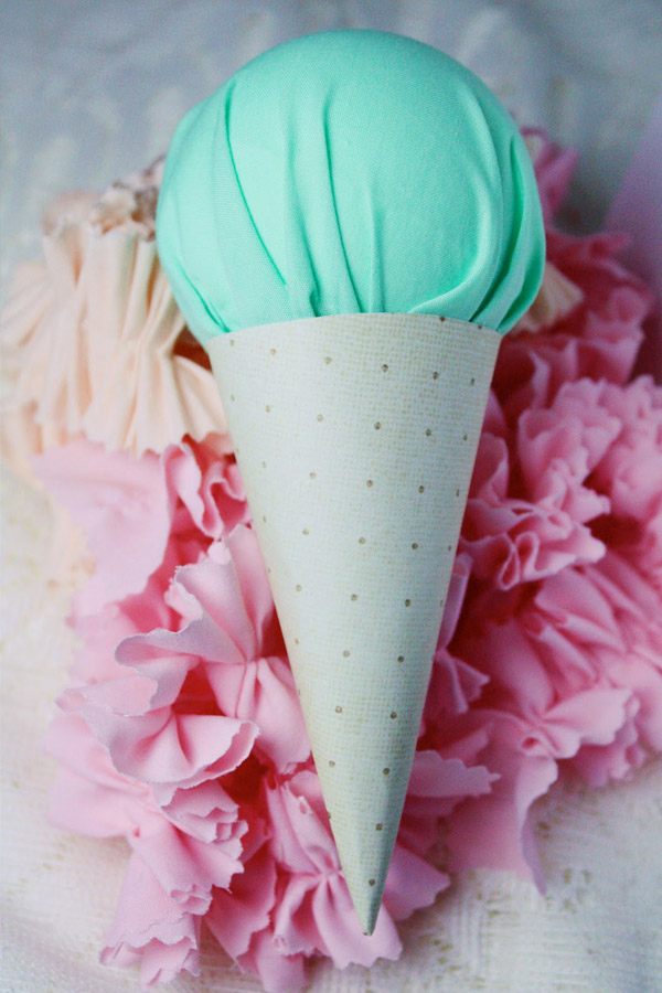 Aunque el tiempo todavía no acompaña como nos gustaría, los primeros rayos de sol ya están inundando terrazas, parques e incluso algunas playas. Es innegable que empieza la temporada y con ella las bodas de primavera y verano. Hoy os traigo un tutorial perfecto para esta época del año que podéis utilizar para decorar una parte de la boda, la candy bar o un carrito o barra libre de helados, porque precisamente de eso se trata, de confeccionar cucuruchos de tela que o bien podéis dejar tal cual o colgarlos con ayuda de una cinta a distintos niveles y alturas para conseguir un efecto más artístico mediante una decoración suspendida. Vais a necesitar: Varias bolas de porexpan, tela de algodón de diferentes colores, pistola de pegamento caliente, pegamento, tijeras dentadas, papel rígido o cartulina, relleno de poliéster, cinta, máquina de coser, aguja e hilo.