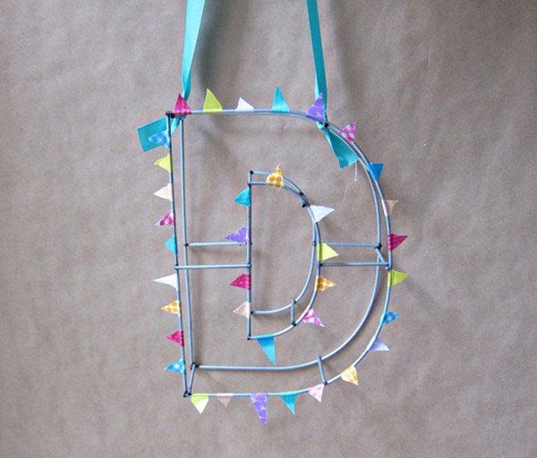 Una vez tengamos toda la letra decorada únicamente tendremos que cortar el washi tape dándole una forma triangular. Para finalizar sólo nos falta atar un trocito de cinta a la parte superior de la letra para que podamos colgarla, aunque si lo preferís podéis colocar directamente la letra apoyada sobre cualquier punto o superficie sin necesidad de colgarla.