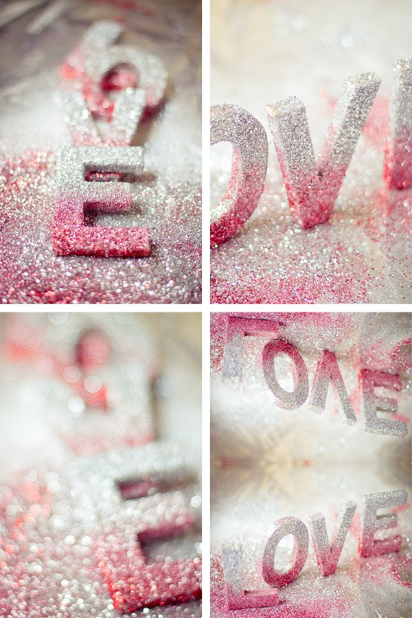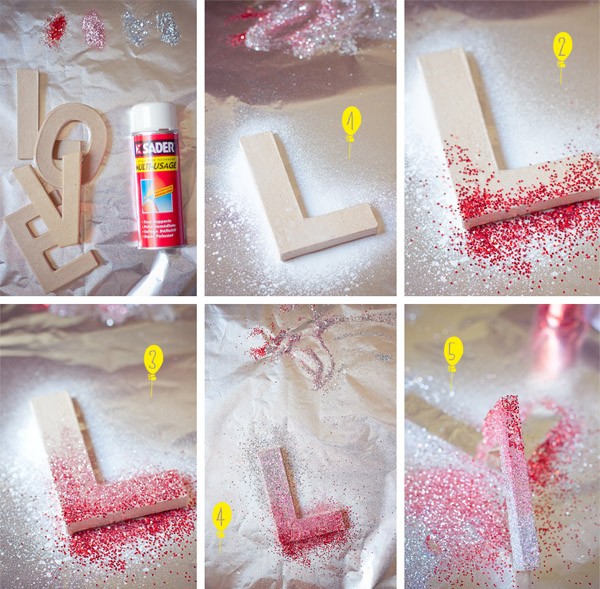 Hace mucho que no hablamos en el blog de los brillos y la verdad es que es un recurso muy eficaz cuando lo que se busca es hacer destacar un objeto o espacio especial. Los reflejos siempre atraen todas las miradas así que el tutorial de hoy consistirá en decorar unas letras pensadas para que brillen. Podéis colgarlas del techo, pegarlas en una pared o dejarlas sobre un bufete, os aseguro que en ningún sitio pasarán desapercibidas. Vais a necesitar: letras de cartón, pegamento en spray, purpurina plateada, rosa y fucsia. Lo ideal es mezclar purpurina de un tamaño mayor con otra más pequeñita, así podéis comprar purpurina plateada de dos tamaños, purpurina rosa de tamaño pequeño y fucsia de mayor tamaño. De esta forma, se creará un efecto óptico que dará mayor dimensión a la letra.