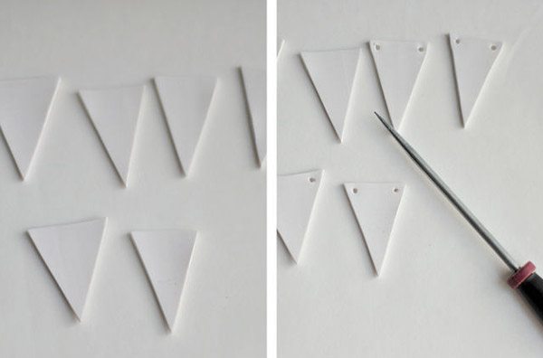 3. Hacer dos agujeritos con un punzón en las dos esquinas de la parte superior de cada triángulo.