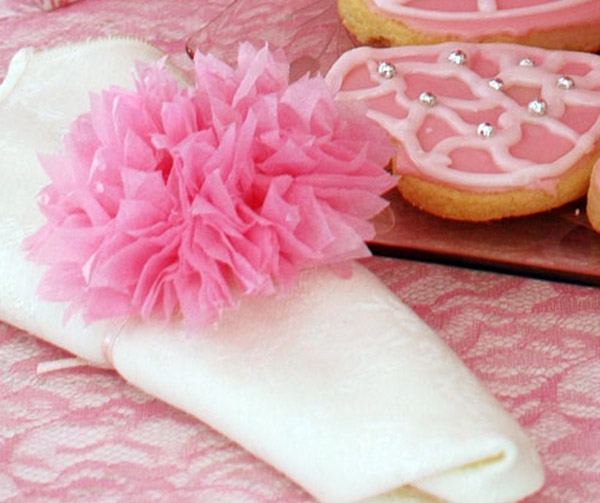 También pueden utilizarse los pompones para decorar las servilletas, en este caso lo único que hay que tener en cuenta es que tendréis que utilizar menos hojas de papel, con 4 ó 5 bastarán, y los pliegues deberán ser más pequeños.