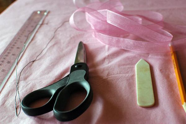 Vais a necesitar: 8 hojas de papel de seda, regla, tijeras, plegadora, lápiz, alambre y cinta para colgar el pompón.