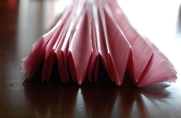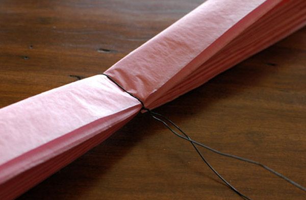 Cuando hayáis terminado de doblar todo el papel coged una regla y buscad el centro del papel. Coged un alambre y anudarlo alrededor de la parte central del papel de seda.