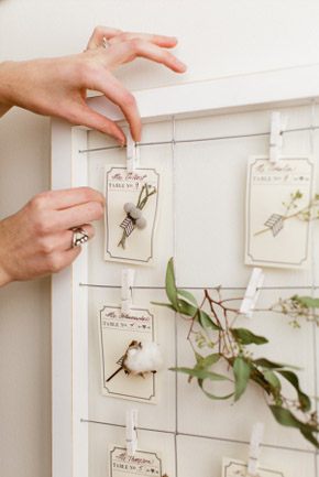 También debéis colocar un seating plan en un panel que situaréis a la entrada del salón o del recinto donde se celebrará el banquete para que de este modo cada invitado ya sepa previamente dónde ha de sentarse. En este caso las tarjetas se han colgado de un alambre con ayuda de unas pinzas blancas, pero podéis emplear cuerda rústica y pinzas de madera para darle un aire más natural, aunque una vez más os digo que podéis confeccionar el panel a medida de vuestros gustos e imaginación. ¡Espero que os sirva de inspiración!