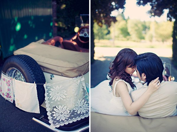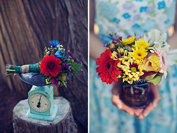 Estas vacaciones he tenido tiempo de reencontrarme con muchas cosas, algunas de ellas aparcadas, otras escondidas y algunas incluso olvidadas. Volver al campo, al pueblo y más concretamente a la casa de mis abuelos siempre es un viaje placentero para los sentidos y para la memoria. Por eso hoy he querido iniciar esta nueva etapa tras las vacaciones de verano con un post que me trae gratos recuerdos, los de mi abuela materna, una gran costurera, amante del ganchillo, de las cosas hechas a mano y de todo tipo de labores y costuras. Si alguna de vosotras es como ella podréis hacer de vuestra boda algo especial con tan sólo aguja, hilo e imaginación. Las fotografías que hoy os traigo ilustran todo tipo de ideas que podéis confeccionar vosotras mismas, empezando por el marco de la ceremonia, realizado con telas de diferentes colores, botones divertidos de distinta forma y tamaño, carretes de hilo y bobinas de lana. ¡Me ha encantado! También podéis colgar unas guirnaldas confeccionadas con triángulos de tela de colores divertidos o colocarlas adornando los buffets, es un detalle sencillo pero muy vistoso. Otra idea que me ha gustado es la de decorar distintos modelos de sillas antiguas con tapetes de ganchillo y utilizar el mismo recurso para adornar el coche de los novios, nunca se me hubiera ocurrido. Y ¿qué os ha parecido la idea de utilizar como centro de mesa un costurero? Sencillamente genial, además de original. Para acabar no podía dejar pasar el detalle del chal de ganchillo de la novia, un complemento vintage en auge que me tiene enamorada. Lo veo perfecto para dar un toque rústico al conjunto.