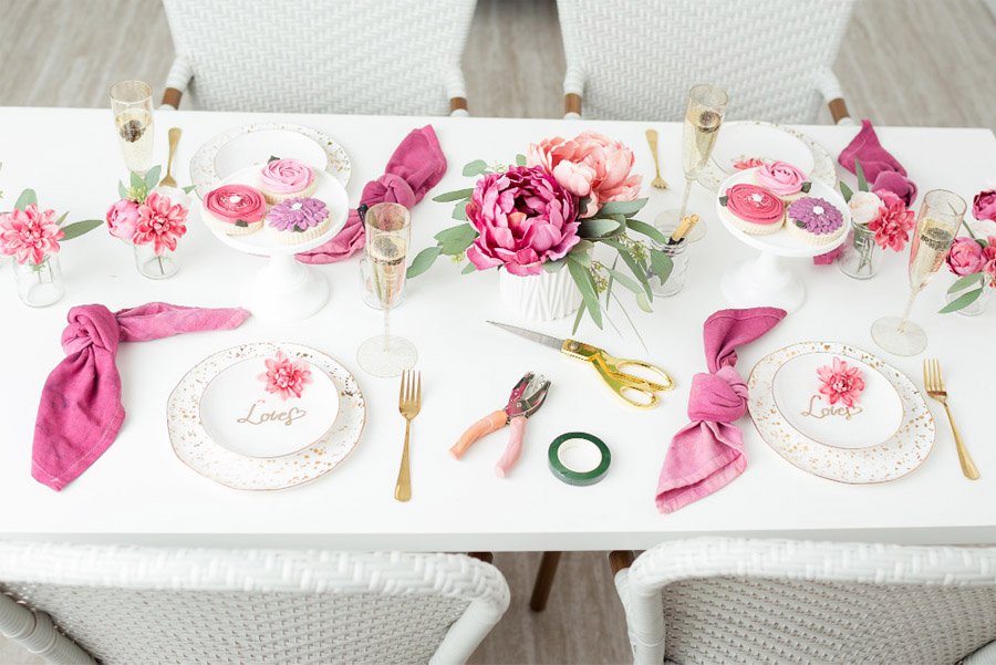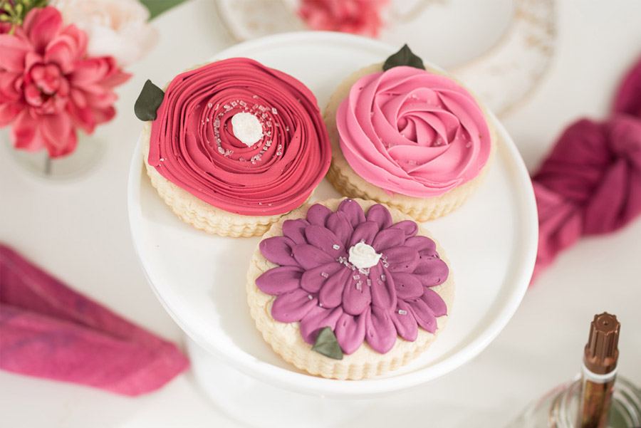Para la puesta en escena primero se creó una invitación muy sencilla, acorde con la idea planteada, sobre una cartulina de color crudo texturizado respaldada por otra de papel kraft y acompañada de una bolsa transparente con pétalos de flores. La selección de las flores es muy personal pero podéis elegir peonías, hortensias, ramas de eucalipto o de olivo, crisantemos, tulipanes y jugar con tonalidades acordes. Los rosas, lavandas y malvas siempre dan buen resultado, pero en función de la época del año podéis utilizar tonos más fríos o más cálidos. La barra de flores se confeccionó con una serie de jarrones cilíndricos de cristal, junto a tres cubos de metal galvanizado para sostener los tallos más altos y un gran cartel caligrafiado, situado en la parte superior de la barra. Sobre la mesa de manualidades, que también es la mesa del almuerzo o brunch, se dispusieron las distintas herramientas necesarias para la confección de los ramos (tijeras, cinta floral, papel kraft, etc.), al tiempo que se decoró con pequeños arreglos florales y galletitas de azúcar, diseñadas también con motivos de flores, que las invitadas podían ir degustando mientras confeccionaban su ramo. Una vajilla ideal con toques dorados a juego con la cubertería, junto a las servilletas de lino malva y varias copas de cóctel de champán con moras, completaron el magnífico conjunto.