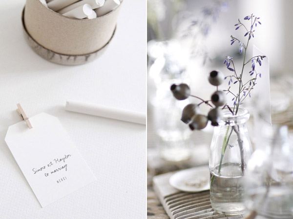 Cierra los ojos… Imagina una boda donde el blanco sea el color predominante. Un entorno natural, con árboles, vistas al mar, las olas rozando las rocas al atardecer… Imagina una boda sencilla, para pocos pero no por ello menos importantes invitados. Eso es lo que hoy os propongo, una boda ligera, sin artificios, para novias dulces, minimalistas, amantes de la simplicidad y de todo lo que respire naturalidad, novias de ‘cara lavada’ diría yo. Para conseguir este tipo de boda deberemos enfocar la decoración en los pequeños detalles y en texturas naturales. Empezando por las invitaciones, que podrían ser de papel de algodón blanco a modo de carta atada con una cuerda de lino natural y sobres de papel Kraft. La fiesta se podría celebrar en un cobertizo de madera con paredes blancas y techos altos con vigas a la vista, donde una refrescante limonada casera recibiría a los invitados. Un entorno sencillo pero bonito y, sobre todo tranquilo, decorado con detalles florales en tonalidades blancas, marrones y plata, dispuestos en racimos simples o en tallos individuales colocados cuidadosamente en el interior de botellas recicladas, jarras de cristal transparente y cajas viejas de madera. Para el almuerzo utilizaremos una larga mesa imperial con mantel de arpillería y la disposición de los invitados estará escrita a mano con tiza blanca sobre un rollo de papel Kraft colgado de la pared, a juego con la numeración de las mesas, que consistirá en una pequeña banderita, del mismo papel, caligrafiada y sujeta a los pequeños ramilletes de flores del centro de mesa. La vajilla deberá mantener el mismo aspecto natural, por lo que podríamos utilizar una realizada en fibra de bambú con una cubertería del mismo material. Y como agradecimiento para los invitados, unas bolsitas de muselina con semillas naturales en su interior. Si estáis buscando una boda ‘slow’, donde lo más importante sea la creación de un entorno relajado y natural, estas ideas os serán de gran ayuda.