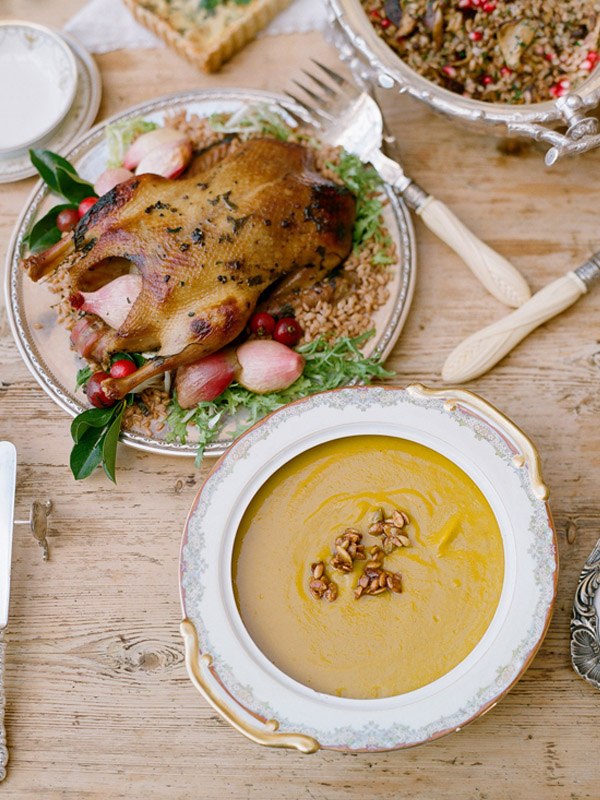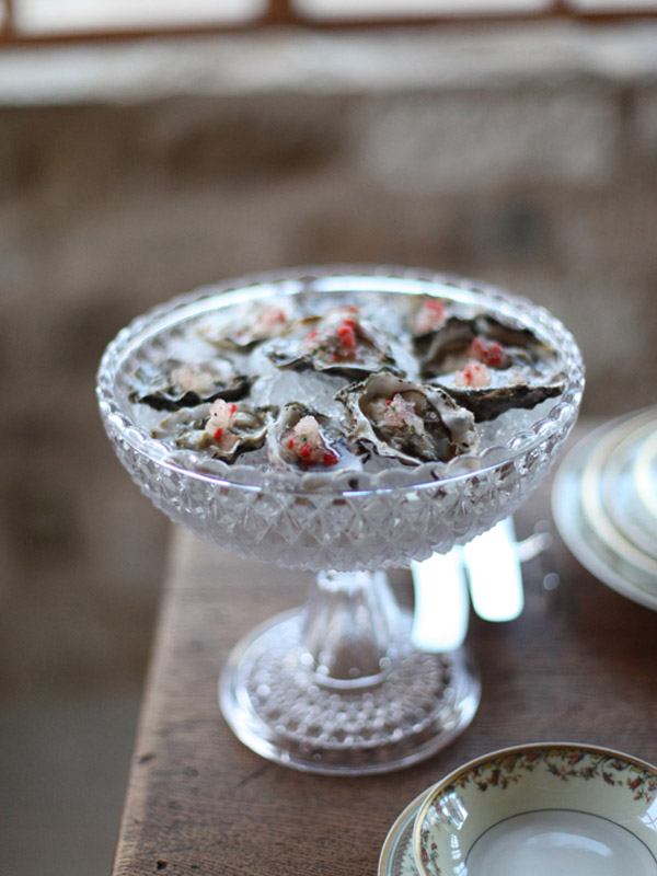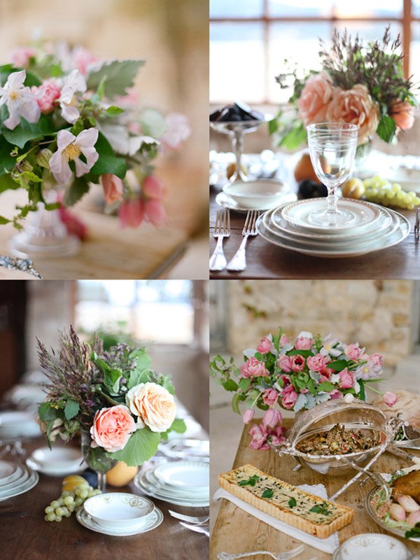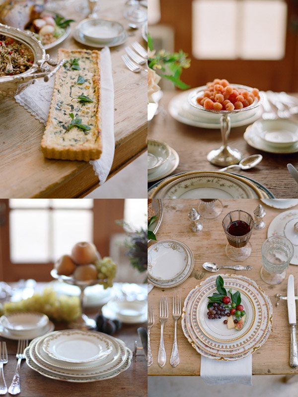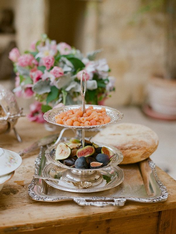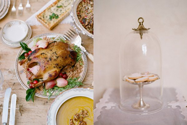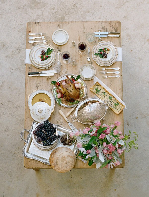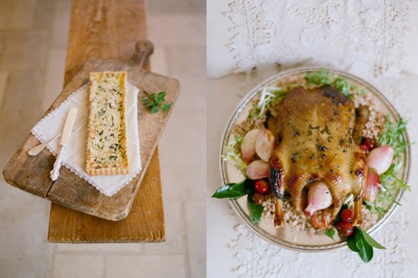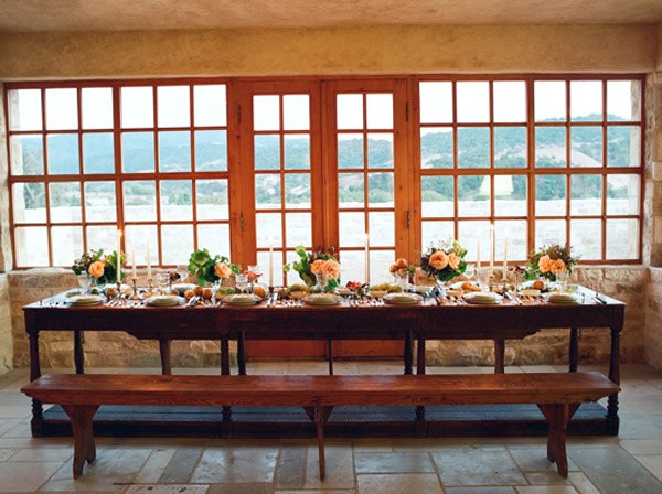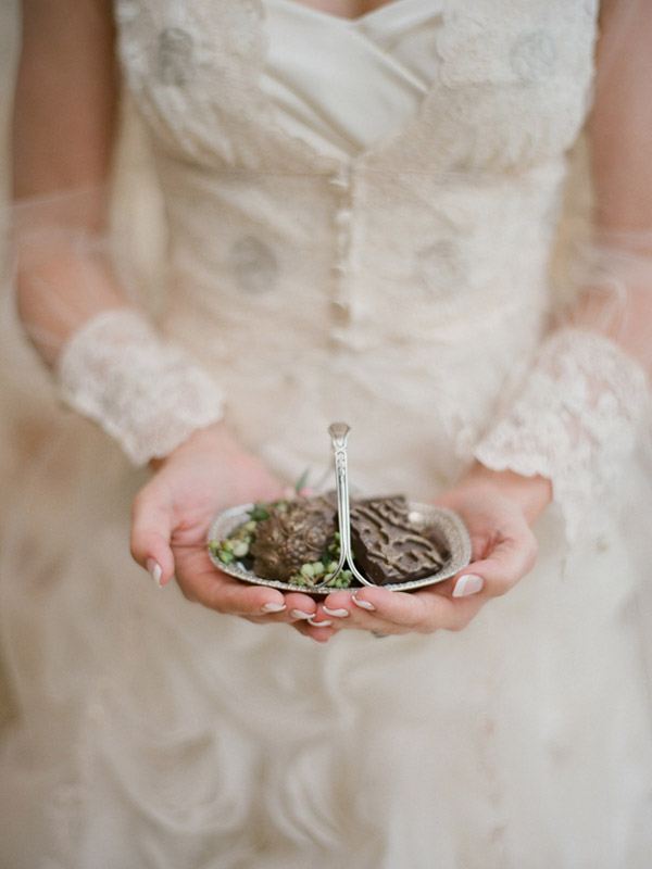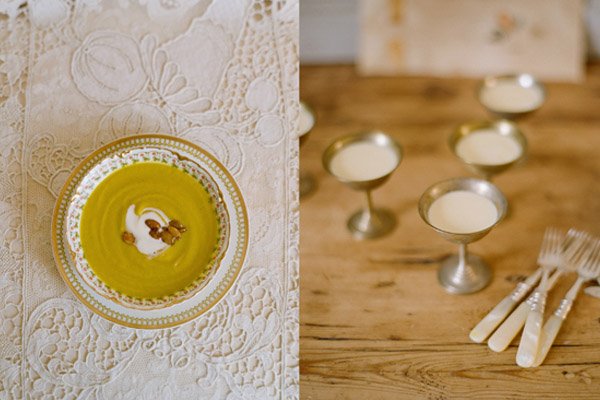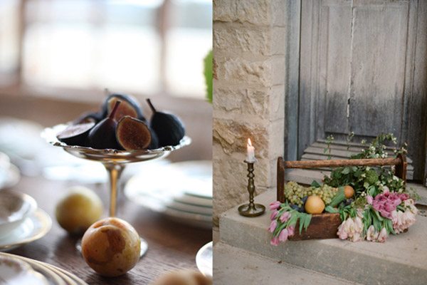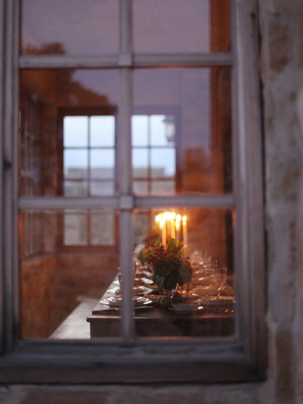 Tengo que reconocerlo, soy de esas personas a las que les gusta comer bien y soy también de las que disfrutan con una mesa bien decorada. De hecho una de las cosas que más me apasionan cuando hay una celebración especial o voy de invitada a casa de cualquier amigo es observar cómo ha decorado la mesa, me pasaría horas estudiando cada detalle, los bordados del mantel, el color de las copas, la disposición de la vajilla… Y lo mismo me pasa cuando empieza el desfile de platos y recetas. Por eso para mí el almuerzo o cena es fundamental en una boda y no sólo me refiero a la calidad de la comida sino también a su presentación y servicio. El post de hoy une estos dos aspectos fundamentales para que el catering de vuestra boda triunfe y acabe por convertirse en un momento inolvidable. Si tenéis tiempo observad detenidamente cada detalle de las imágenes, yo me pasé un buen rato haciéndolo a medida que iba escribiendo este post. La gran mesa de madera, sin mantel, para que luzca más el paso de los años, la vajilla de plata envejecida, la cubertería con mango de nácar, la combinación perfecta entre flores y frutas… Y ¿qué me decís de los platos? El pan con queso, miel e higos, la fuente de ostras, la quiche con pequeños corazoncitos azucarados o los chocolates orgánicos con relieves vegetales. Todo el catering es obra de Eat Drink Garden y la maravillosa puesta en escena ha sido diseñada por Merryl Brown Events, que ha conseguido transmitir el equilibrio perfecto entre placer físico y sensorial. Para finalizar, me quedo con la calidez de la última instantánea, la visión de las velas encendidas a través de los grandes ventanales. ¡Todo un placer para los sentidos y para el corazón!
