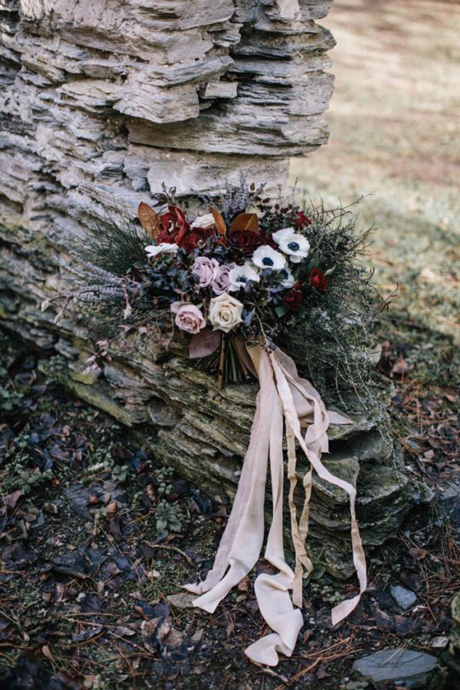 Las bodas de invierno nos ofrecen unas posibilidades únicas que no se dan en otra época del año, por eso conviene estudiar bien la ubicación no sólo de la boda sino también del reportaje de los novios, para poder sacarles el mejor partido posible. Hoy comparto con vosotros una sesión de inspiración invernal que tiene como telón de fondo el paisaje natural de las montañas nevadas, todo un espectáculo digno de ser fotografiado. En esta ocasión el entorno y el estilismo han propiciado que la sesión tenga un trasfondo medieval, como podéis apreciar en las tonalidades elegidas, grises, marrones y negros. Al mismo tiempo se ha buscado también jugar con la simplicidad en la decoración para dar un mayor protagonismo al paisaje y al espacio. Los tonos grises y el contraste con la madera oscura y la vajilla de oro envejecido resaltan las paredes de piedra sin tratar. Al mismo tiempo, la calidez que aportan las velas y la distribución de varios candelabros en la parte central de la mesa le otorga a la misma una elegancia decadente muy apropiada con el entorno y la naturaleza de la sesión. Esas mismas tonalidades oscuras, empleadas también en las flores y en el estilismo de los novios contrastan con el blanco de la nieve pero a la vez van en consonancia con los elementos naturales de la montaña, estableciendo un ambiente cambiante digno del impresionante entorno natural que les rodea. El espectacular vestido de novia negro de Leanne Marshall pone el punto sofisticado a un estilismo poco frecuente pero no por ello menos elegante.