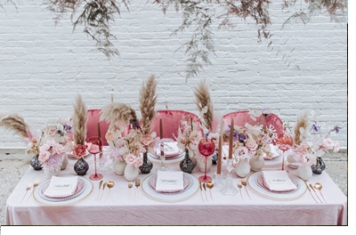 Estamos ya en la recta final de la semana más rosa del año y por eso en la inspiración de hoy es el color protagonista. No sé si a vosotros os pasa pero a mí me resulta muy difícil escoger el tono perfecto de rosa, sobre todo cuando se trata de combinar varias intensidades diferentes, porque no es lo mismo un rosa empolvado con una base de suave melocotón que un tono que roza el fucsia. Pero creo que en la decoración de la mesa que vais a ver a continuación, sus creadoras han dado en el clavo. Es importante destacar el espacio en blanco que rodea toda la puesta en escena y la altura de sus techos, el primer punto porque resaltará mucho más el colorido de los distintos tonos de rosa y, el segundo, porque es clave para situar una decoración floral suspendida como la que se ha utilizado. Para la mesa se ha empleado una combinación de tonalidades cálidas de rosas suaves con tonos de rosa más fríos, junto al oro y los tonos tierra. Destaca la cerámica blanca de los pequeños centros de mesa, la cubertería en oro y rosa, la cristalería con copas de cristal rosado y el toque botánico de los plumeros. Para el sitting se ha utilizado una pequeña plaquita de mármol con el nombre de cada invitado caligrafiado en tinta dorada, un recurso sencillo pero muy natural. Pero quizás el elemento que pone el toque perfecto a toda la decoración de la mesa son las sillas de terciopelo rosa que se han convertido en tendencia esta temporada, siendo muy demandadas tanto en decoración como en bodas. Una puesta en escena totalmente atemporal que perfectamente puede adaptarse tanto a una boda de verano como de invierno. Espero que os guste el resultado.