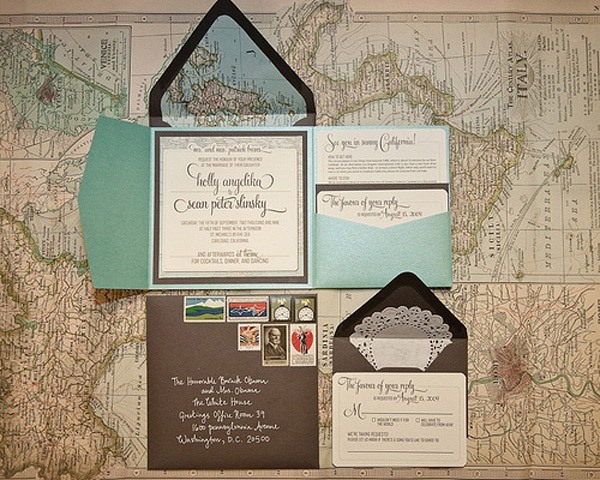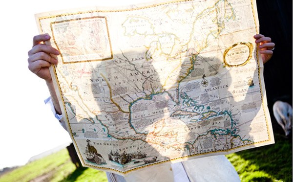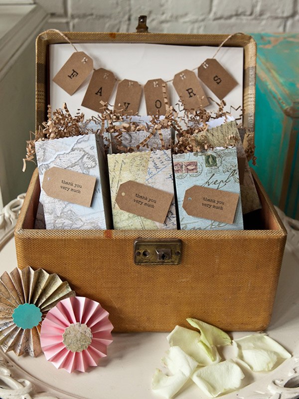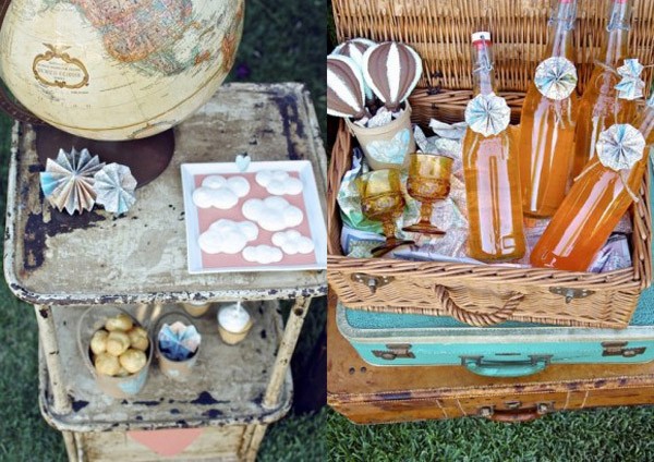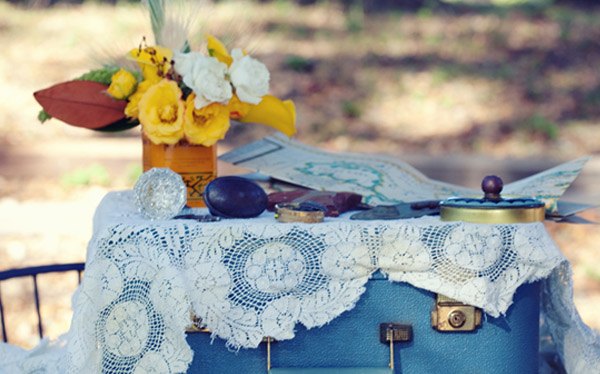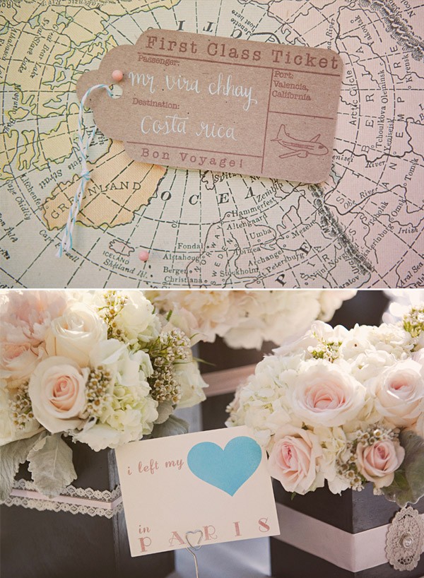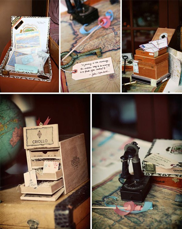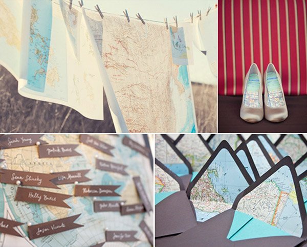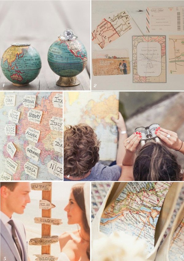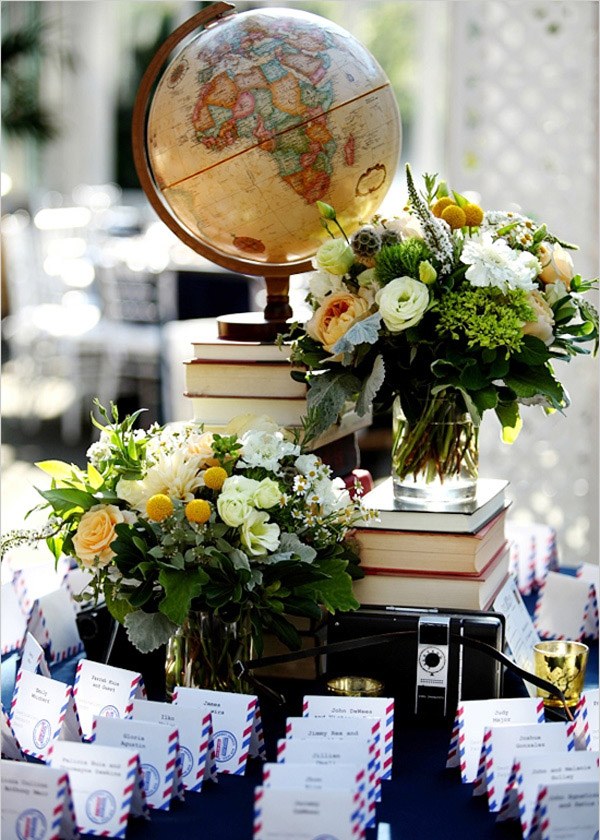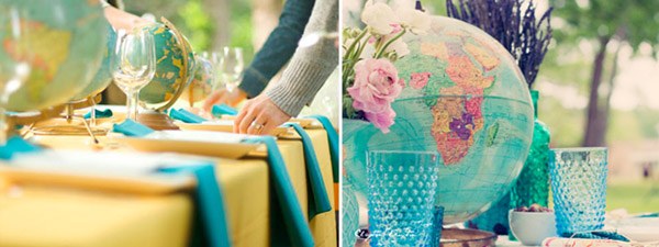 Seguro que más de una ya está soñando con las vacaciones, deseando coger las maletas y poner rumbo a la playa, al pueblo, a una isla paradisíaca o a cualquier capital europea. Yo apenas he tenido tiempo de nada, con decir que todavía no he hecho ni el cambio de armario con eso os podéis hacer una idea de cómo voy últimamente. Me faltan las horas, los minutos y hasta los segundos pero hay una imagen en el salvapantallas de mi memoria que se repite cada verano y es la de una playa cristalina con unas pequeñas islas al fondo. Un destino para el que cuento las horas como si del despegue de una nave espacial se tratara. Por eso, para ir refrescando la mente, hoy os traigo un post de inspiración viajera dedicado a todos esos novios aventureros que creo que son la mayoría porque si por algo nos alegramos todos cuando termina la boda es porque empieza la luna de miel, ¿a que sí? Bueno, pues si buscáis darle un toque viajero a vuestra boda aquí tenéis un montón de ideas por las que empezar: desde maletas antiguas hasta mapas del mundo, aviones de papel, un globo terráqueo, postales de lugares remotos… Podéis utilizarlas como decoración, seating, centro de mesa e incluso como invitaciones o como packaging para envolver los regalos de los invitados. A mí me encanta el papel o la tela de mapamundi, queda genial para decorar. Si sois un poco manitas podéis confeccionar vuestras propias servilletas o forrar los centros de mesa a juego, también podéis hacer pequeñas libretitas a modo de agenda o diario de viaje con este tipo de papel como regalo para vuestros invitados. Otra idea que me parece ideal es la de utilizar un globo terráqueo donde los invitados puedan dejar sus mensajes y dedicatorias. Es un objeto que siempre me ha gustado, desde niña, pero nunca se me hubiera ocurrido usarlo para ese fin, la verdad. Aunque como más me gusta es como centro de mesa combinado con flores y algún otro elemento viajero de aire vintage como unos prismáticos o un pequeño avión de metal, sin duda alguna le dará un toque diferente y muy personal a vuestra mesa.