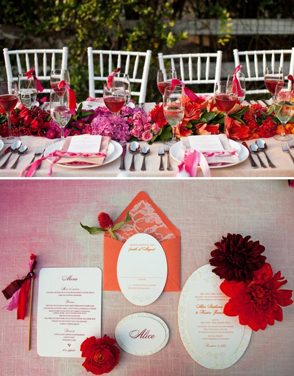 La canción insignia de la cantante francesa Édith Piaf, además de ser una de mis preferidas, me ha servido de inspiración para el post de hoy. ¿Imagináis por qué verdad? Aunque a mucha gente el rosa puede parecerle cursi, bien combinado y siguiendo su paleta de colores, puede llegar a ser un color muy fresco y divertido. Hoy os propongo una decoración en tonos rosas, rojos y naranjas, que os puede dar juego tanto en interior como en exterior. En las fotografías veréis que se han utilizado las mismas flores para el bouquet de la novia y los centros florales, de esta forma se mantiene la uniformidad del conjunto, tanto cromática como estilísticamente. Me ha gustado mucho el detalle que adorna las servilletas a juego con el de las copas, que bien podría ser ejemplo de un rápido DIY, tres tiras de tela de tonalidad similar recogidas en una sencilla trenza. Precioso. Igual que el mantel, en un tono degradado. ¿Y qué me decís del vestido de la novia en rosa? Algún diseñador ya se ha atrevido a mostrar este color en las pasadas pasarelas tanto de Madrid como de Barcelona e incluso pudimos ver alguna pincelada en la pasarela de Nueva York, yo apuesto por romper con el blanco tradicional y por las novias que se atreven con el color. Como detalle a tener en cuenta si queréis rizar el rizo decorativo, el vino, como el champagne, debería ser rosado.