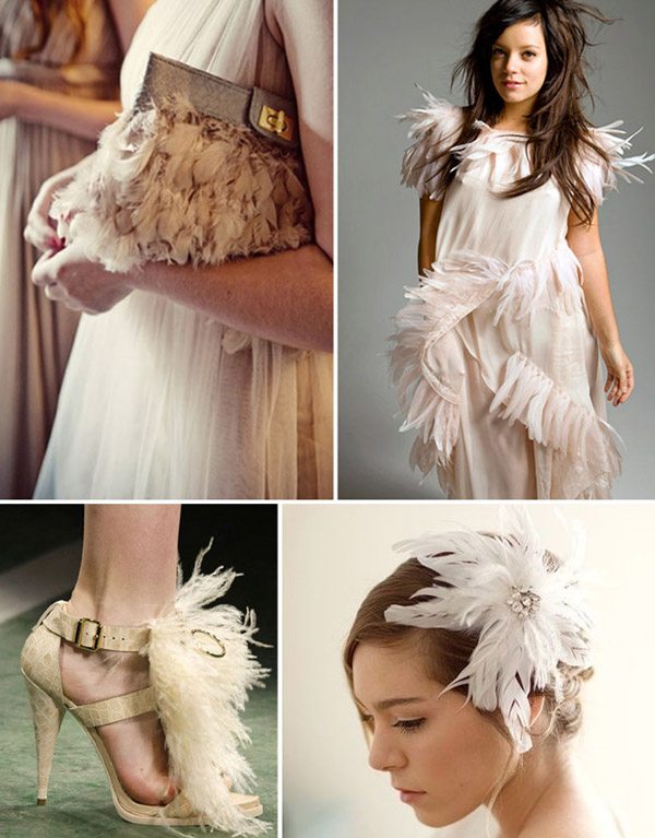 Hoy he soñado con plumas. Sí, creo que la resaca de las fiestas me ha dejado el recuerdo de una falda de plumas que vi en el escaparate de una tienda de moda que me enamoró desde el primer momento. Desde que me enfrasqué en esta aventura del blog cada cosa que veo intento adaptarla al mundo de las bodas y esa falda de plumas en un tono rosa pastel es el mejor ejemplo. No penséis que cuando la vi me imaginé luciéndola en fin de año, no, me imaginé casándome de nuevo luciendo aquella maravilla. Debe ser deformación profesional. El caso es que hoy me ha dado por soñar con plumas, muchas plumas, por todas partes, plumas aplicadas a un montón de detalles, así que me he puesto a buscar por la red ideas que tuvieran ese elemento simbólico que seguro dará un toque de distinción a vuestra boda. Las plumas siempre han sido sinónimo de elegancia y la verdad es que me he sorprendido de la cantidad de cosas que se pueden hacer o decorar con ellas. Empezando por el ‘save the date’, con el texto escrito sobre la misma pluma, o incluso las mismas invitaciones de boda. También se pueden incorporar en los complementos de la novia, como el tocado, el bolso o los zapatos. Incluso en los del novio, un bottonier de plumas quedará súper original en su solapa. Si quieres un ramo de novia espectacular, decídete por uno decorado con plumas, seguro que acertarás. Pero de todo lo que he encontrado, lo que más ha llamado mi atención ha sido la decoración del pastel de bodas, queda precioso decorado con plumas, le da una estética muy chic. Aunque si preferís darle un aire rústico, tomad nota del modelo coronado por un nido, ¿no os parece genial?