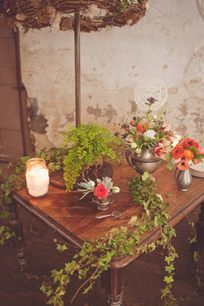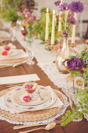 Como ya sabéis, a principios de mayo asistimos, un año más, a la puesta en escena de las tendencias en vestidos de novia y fiesta que se llevarán la próxima temporada. Quizás lo que más llamó mi atención de esta nueva edición de la Barcelona Bridal Week fue la ausencia de una única línea estética ya que la mayoría de diseñadores se decantaron por una tendencia a la diversidad de estilos, muchos de ellos con algún ligero punto en común pero siempre pensando en novias diferentes, con caracteres y gustos de lo más diverso. Cabe destacar que en prácticamente todos los desfiles se percibió también una vuelta al romanticismo, a la novia tradicional, muy femenina, sensual y con un gusto exquisito por los detalles. Por eso hoy he elegido una temática de inspiración romántica para la decoración de bodas en las que predomine el gusto por lo clásico pero siempre desde un punto de vista actual con reminiscencias a un pasado glorioso salpicado por lo vintage. Con detalles de metal envejecido, cubiertos de plata, jarrones de cristal, candelabros y muebles restaurados de estilo afrancesado, salpicados por algún detalle handmade. Las imágenes muestran la recreación de un ambiente que evoca la campiña inglesa, donde las aplicaciones y las coronas de flores adquieren protagonismo convirtiéndose en la esencia de lo romántico. Detalles también en el estilismo nupcial, como el cinturón del vestido de la novia, adornado por una llave antigua o el parasol de tejido calado que, cubriendo el rostro de los enamorados hace más romántica la escena, si cabe.