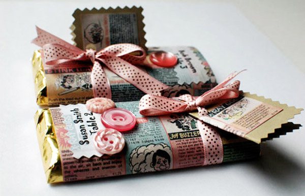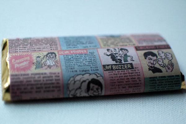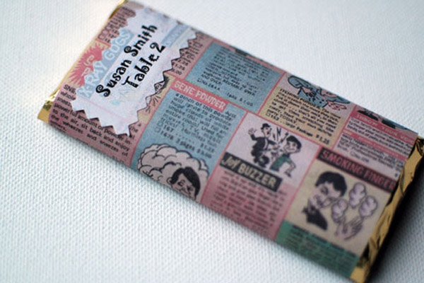 Me encantan los cómics y adoro el chocolate. De pequeña devoraba con pasión aquellos enormes libros de cómics donde salían desde Zipi y Zape, hasta Pepe Gotera y Otilio, La Familia Trapisonda o Rue del Percebe 13, creo que la recopilación en tapa dura se llamaba Magos del Humor. Tenía un montón de esos libros que, finalmente y con el paso de los años, fueron a parar al desván de la casa de mis abuelos. Si a vosotros os pasó más o menos lo mismo, ahora podéis recuperarlos dándoles un papel protagonista en vuestra boda. Os propongo la confección de un sitting de mesa dulce y divertido. Vais a necesitar: una tableta de chocolate envuelta en papel de aluminio, papel de cómic antiguo, cinta de raso, botones, pegamento, cinta de doble cara, perforadora, impresora a color, papel para imprimir los nombres de los invitados y cartulina para las etiquetas de agradecimiento.