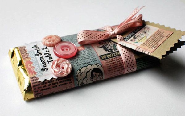 6.- Pasar una cinta a través del agujero y sujetar con ella la barra de chocolate haciendo una lazada. Pegar los botones a la barra de chocolate.